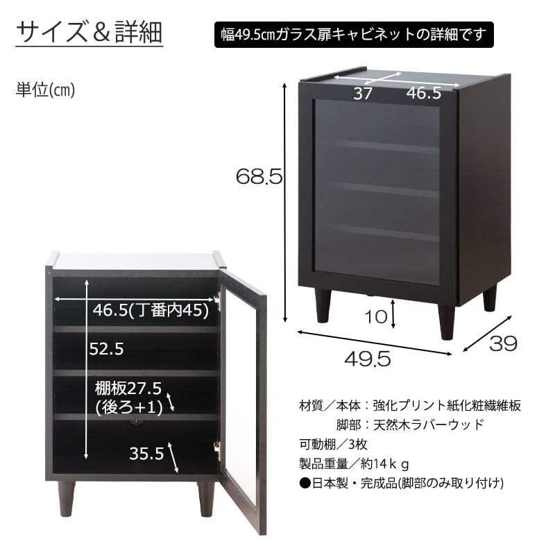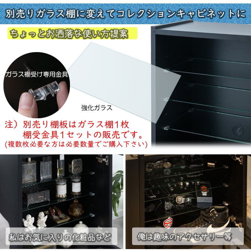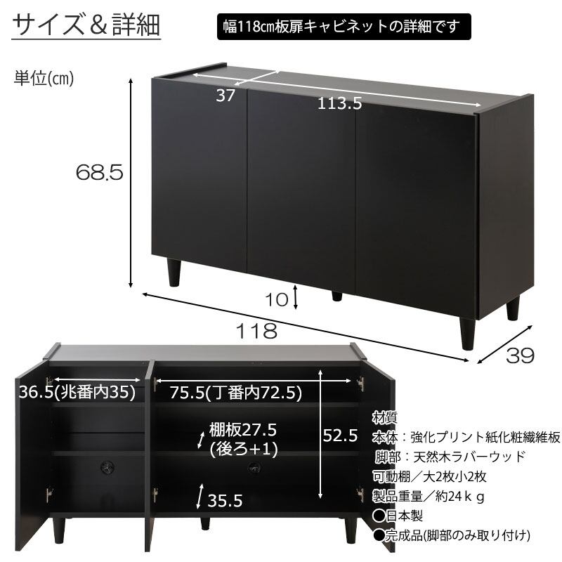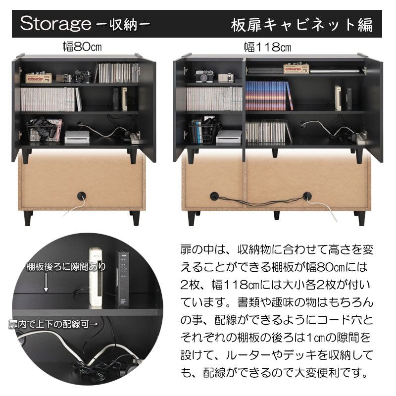 扉の中は、収納物に合わせて高さを変えることができる棚板が幅80cmには2枚、幅118cmには大小各2枚付いています。