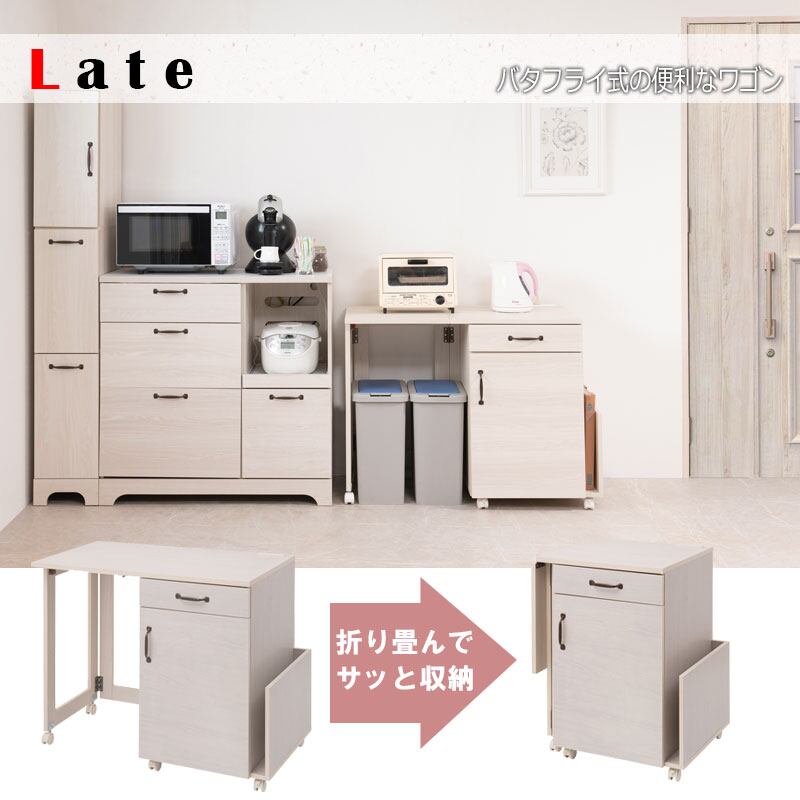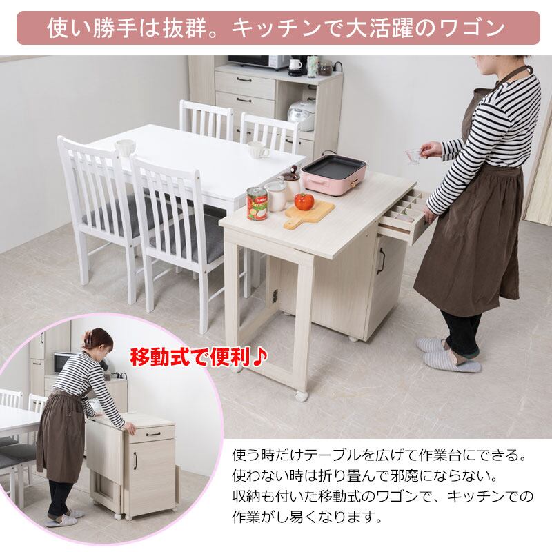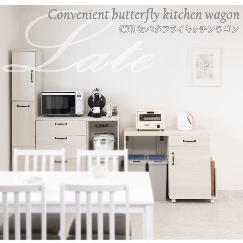 バタフライキッチンワゴン 幅60〜97 折りたたみ式 キッチンカウンター ホワイト木目 キャスター付き LATTE