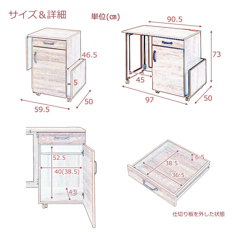 幅97(折り畳み時59.5)×奥行50×高さ73(キャスター含む)cm
