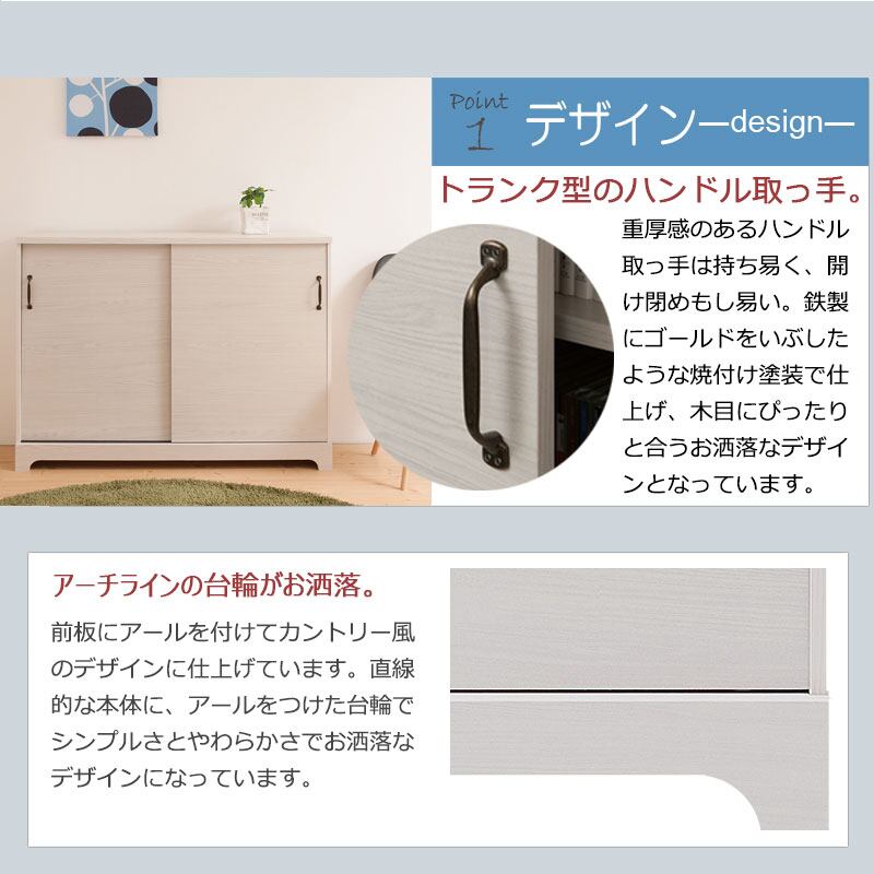 シンプルな中に重厚感あるトランク取っ手、台輪部をアーチ状にくり抜くなど、インテリアになじみやすく、それでいて存在感のある家具をイメージしたカントリーライン。背面化粧仕上げなので、空間の間仕切りにも使えます。