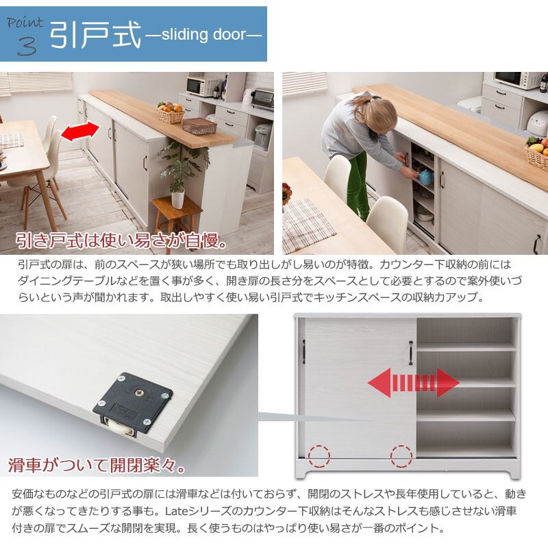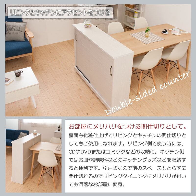 カウンター下キャビネット収納はリビングやダイニングのカウンター下に置ける収納棚です。フレンチカントリー風にほんのり木目が透けるホワイト色。キズつきにくい素材なので子供部屋にもぴったり。引き戸式で省スペース、食器棚やキッチン収納、リビングキャビネットや本棚としても使えます。