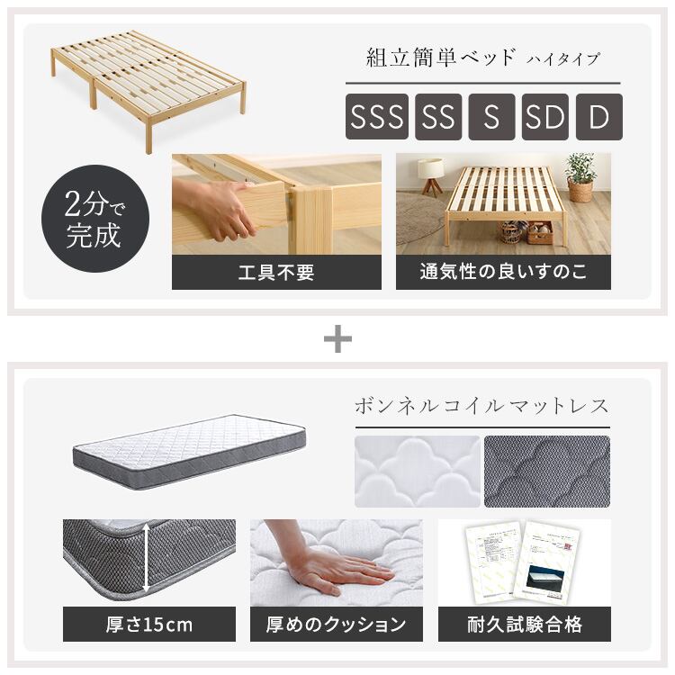 ベッド セミダブル マットレス付き ハイタイプ 2分で完成 組立簡単 ボンネルコイルマットレスセット 天然木 ベッド下収納 通気性