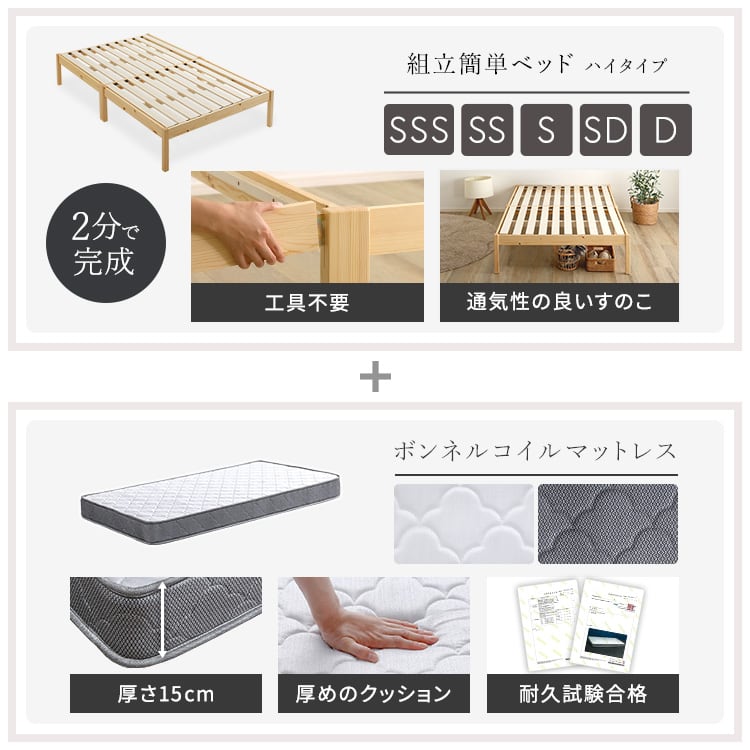 ベッド セミシングルショート マットレス付き ハイタイプ 2分で完成 組立簡単 ボンネルコイルマットレスセット 天然木 ベッド下収納 通気性