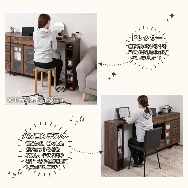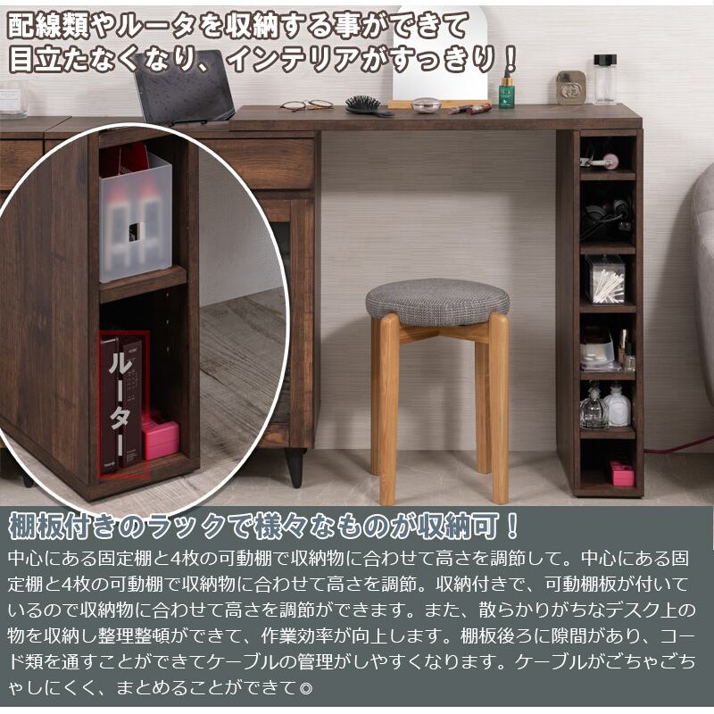 棚板付きのラックで、様々なものが収納可能なマルチキャビネットと合わせて、作業スペースをプラス。パソコンデスク、家事テーブル、リモートワークにも使えます。