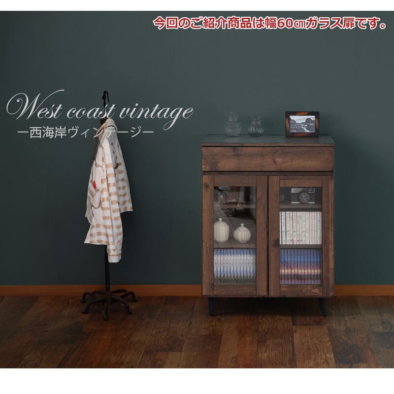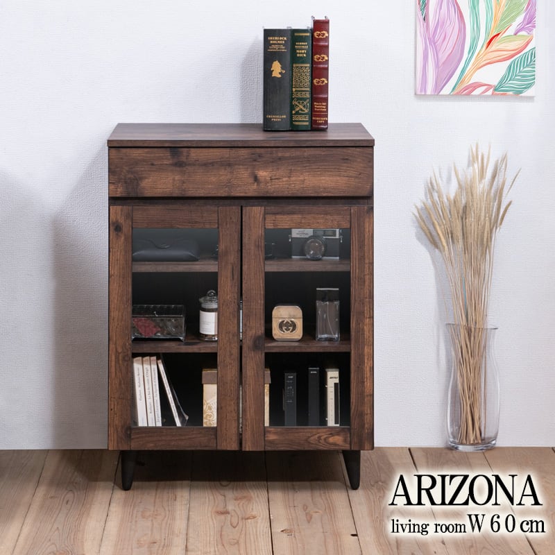 ガラスキャビネット 幅60cm ヴィンテージ 木目調 ディスプレイ収納 見せる収納 リビングキャビネット おしゃれ ARZN