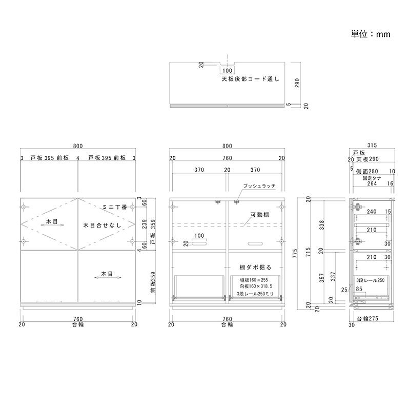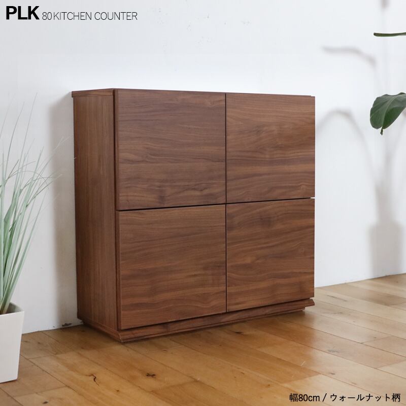キッチンカウンター 80cm ブラウン ウォールナット木目柄 国産 日本製 扉 引出し収納 北欧 スリム キッチン カウンター レンジ台 完成品 背面化粧 目隠しPLK
