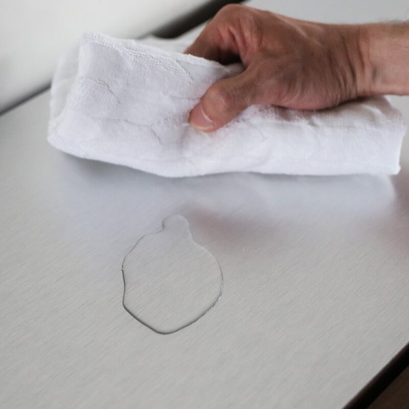 天板には、日本を代表する建材メーカーAICA(アイカ工業)製アルミヘアライン化粧板を採用