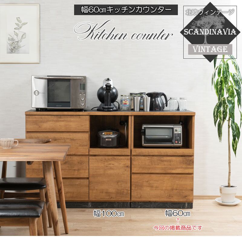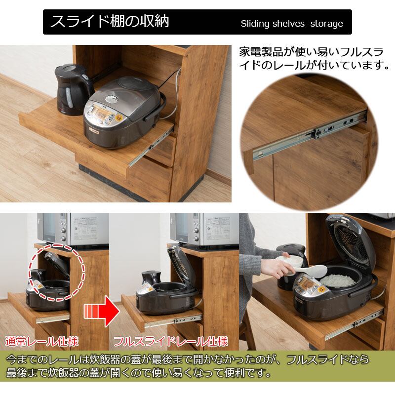 キッチンラック 幅60 レンジ台 日本製 完成品 スライド棚付き キッチン収納 食器棚 家電収納 レンジラック 引き出し付き 木目調 北欧ヴィンテージ オーク調 WR