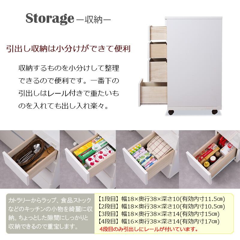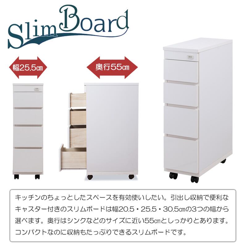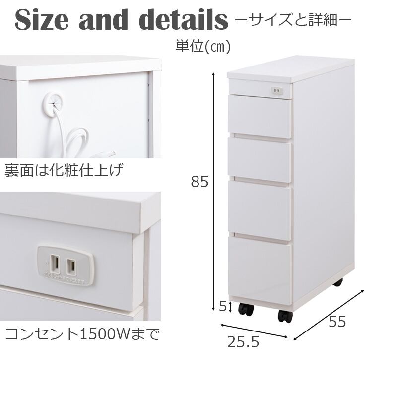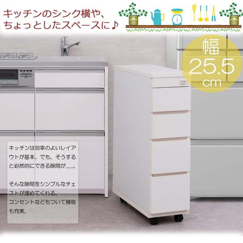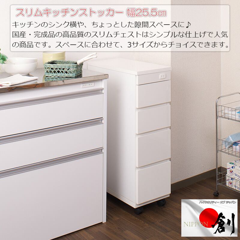 日本製 完成品 すき間収納 スリムチェスト 25.5cm キッチンカウンター 引出し収納 ホワイト 白 キャスター付き 隙間収納 キッチン収納 洗面所収納 国産