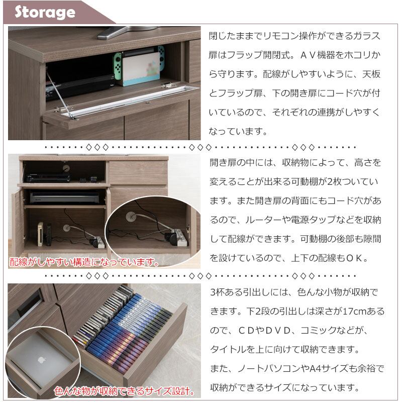 フラップ扉:ホコリを防いで、AV機器・小物収納に便利