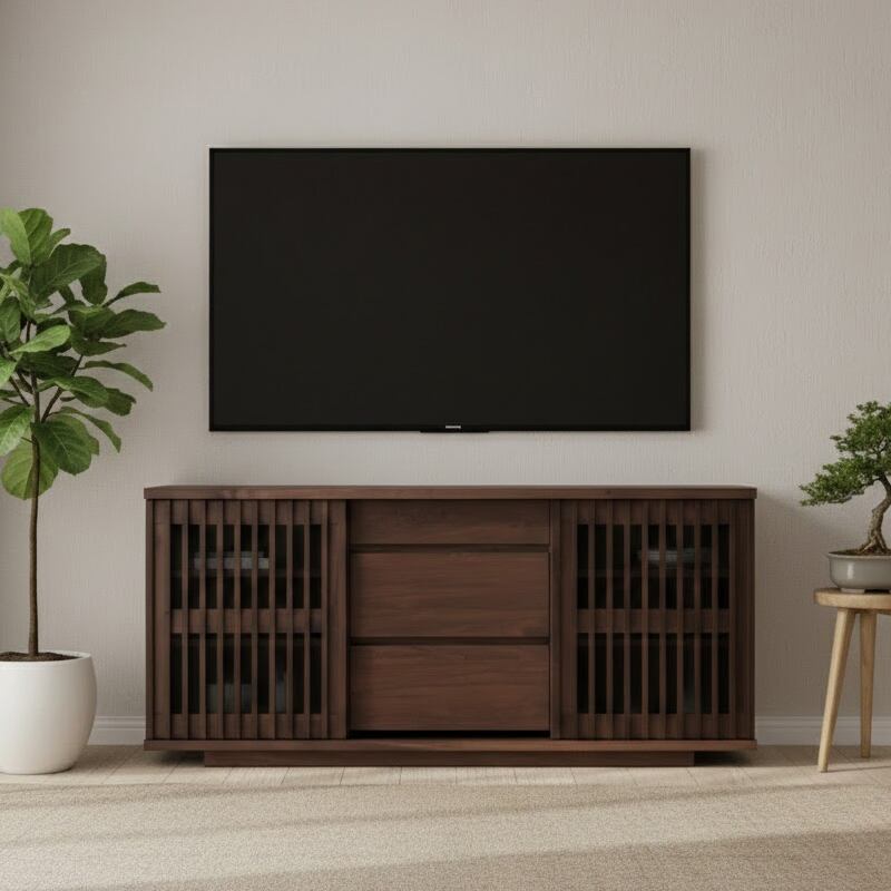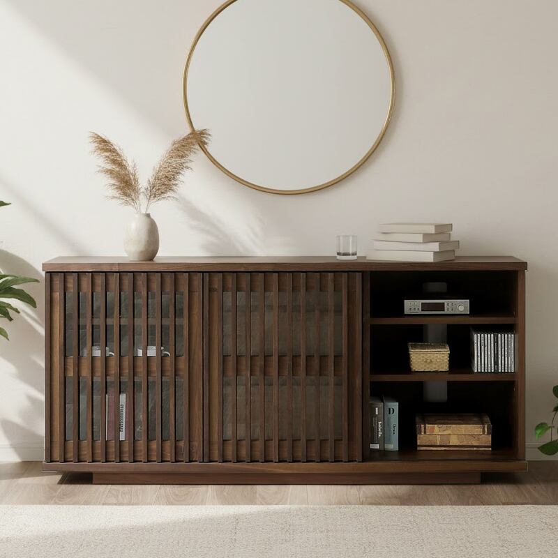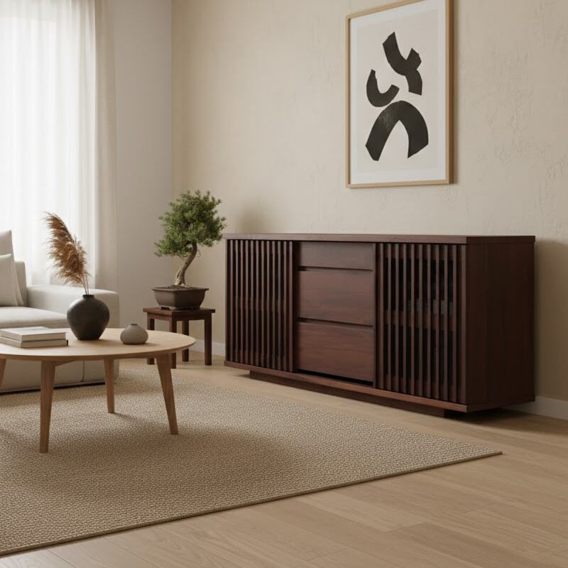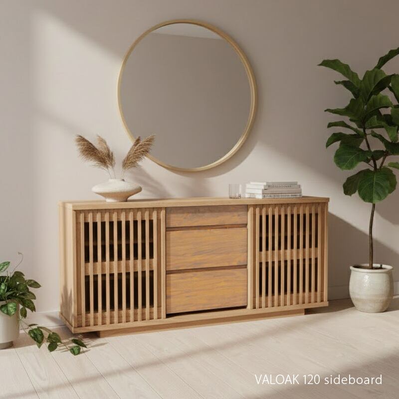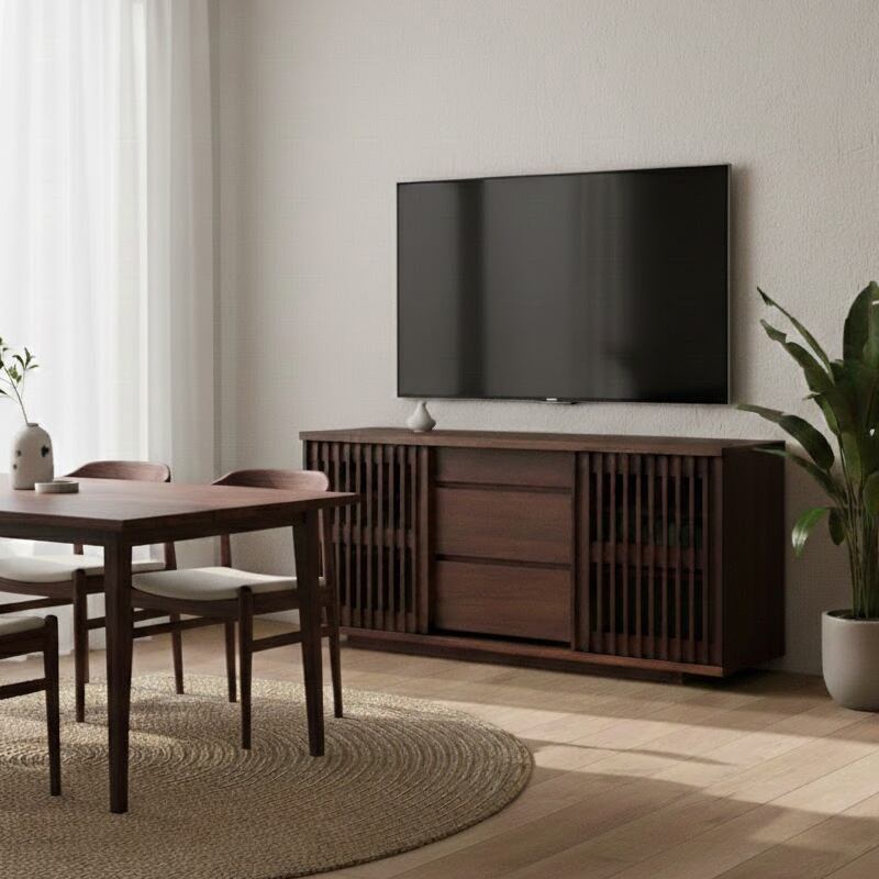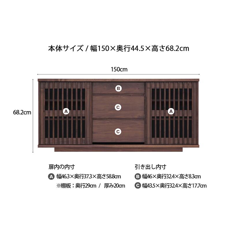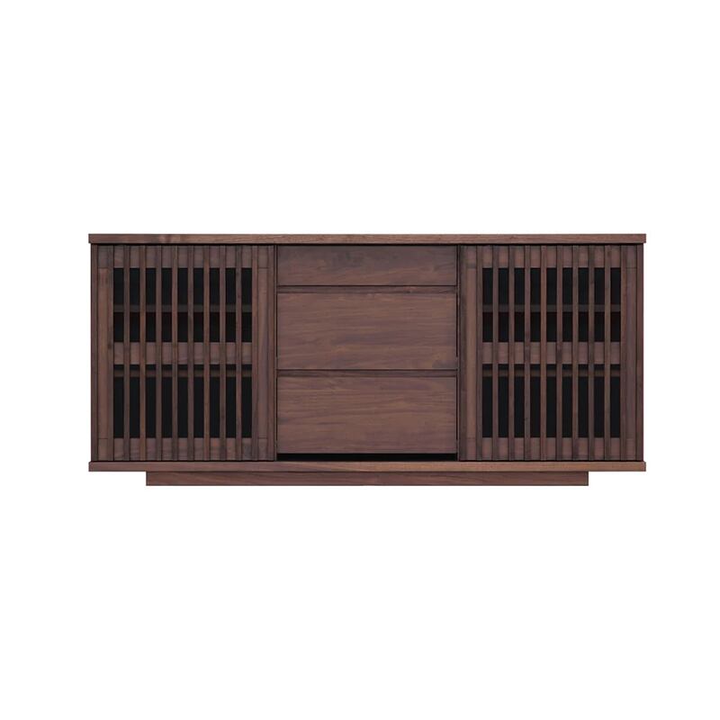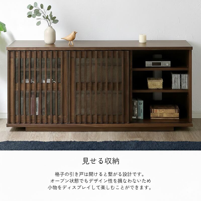 VALOAK リビングボード サイドボード 150cm 国産 大川家具 ウォールナット無垢 ブラウン色 ルーバー キャビネット 完成品 ジャパンディ 北欧モダン 木製 収納 |Japan Made