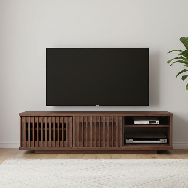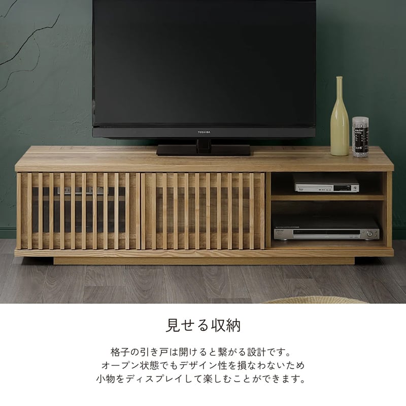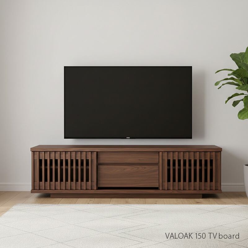 VALOAK テレビボード 幅150cm 日本製 完成品 ブラックアッシュ無垢 ブラウン色 大型TV対応 ジャパンディ 北欧モダン ルーバー 引き戸 可動棚 天然木 ローボード リビング収納 |Japan Made