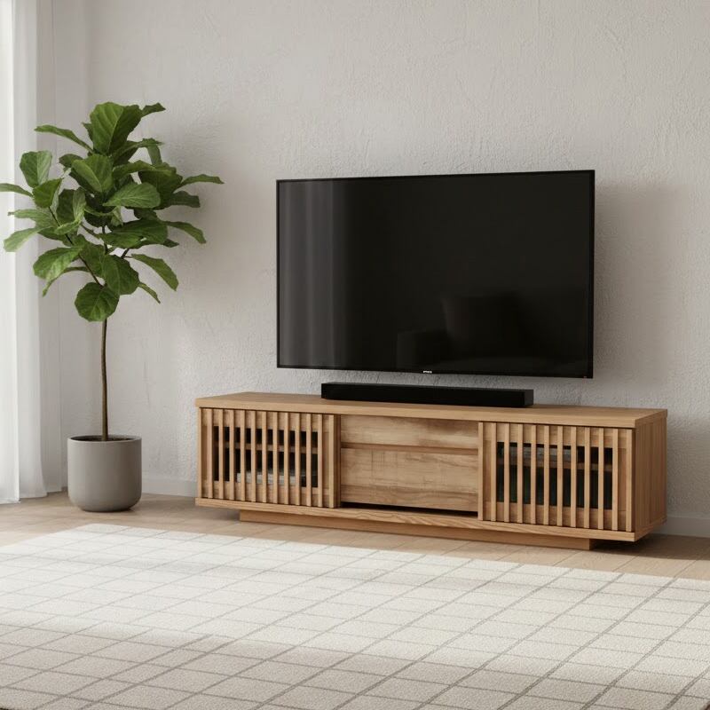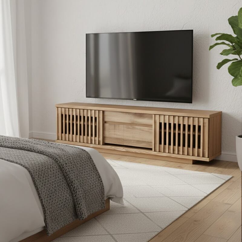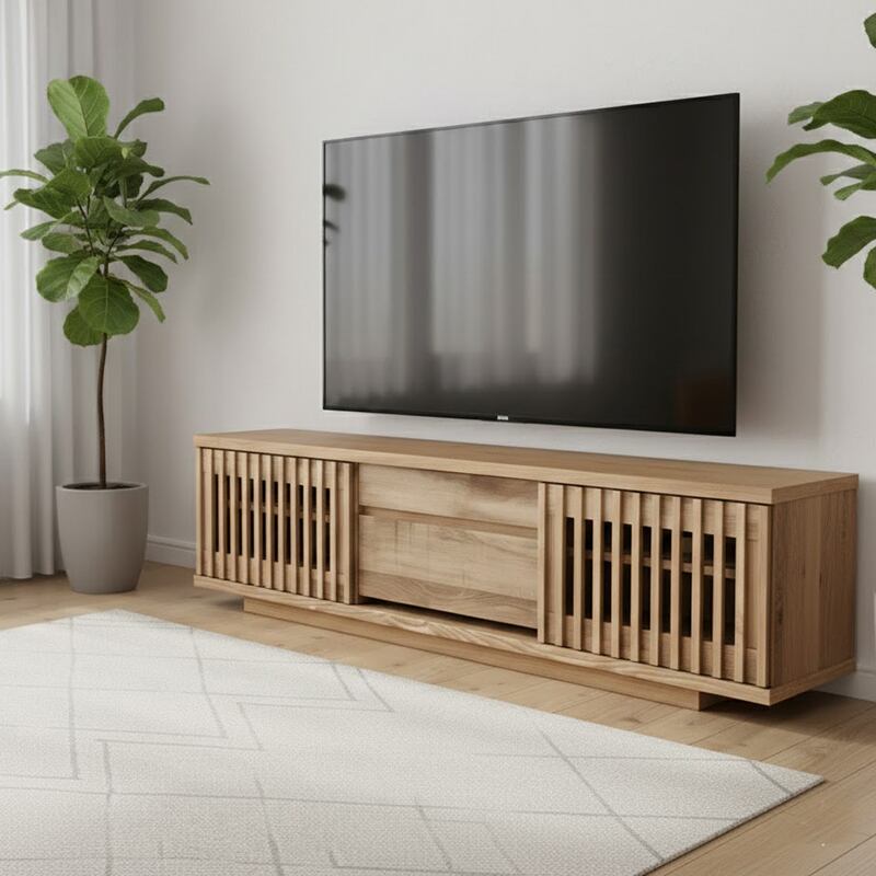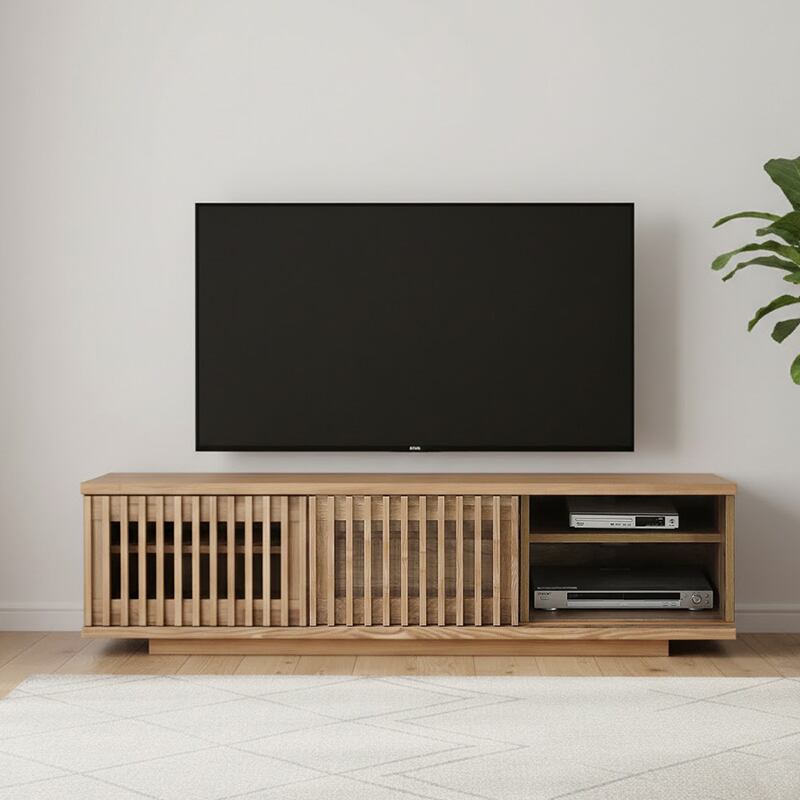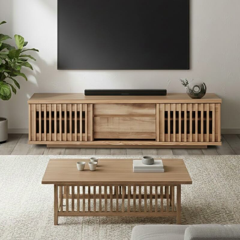 直線を基調とした静かなデザインは、北欧モダンと日本の住空間思想を融合させた“ジャパンディ”スタイル。大型テレビにも対応するワイド設計でありながら、圧迫感を抑えた水平ラインが空間に整然とした印象をもたらします。