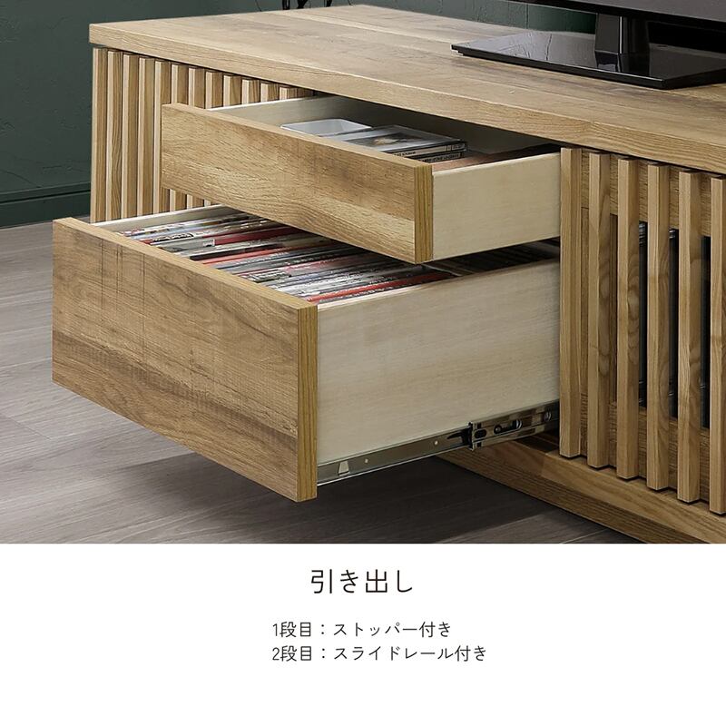 収納は引出しと可動棚付き引き戸を備え、AV機器や日用品を効率よく整理可能。背面化粧仕上げのため、間仕切り配置にも対応します。自然塗装仕上げ、完成品でのお届け。