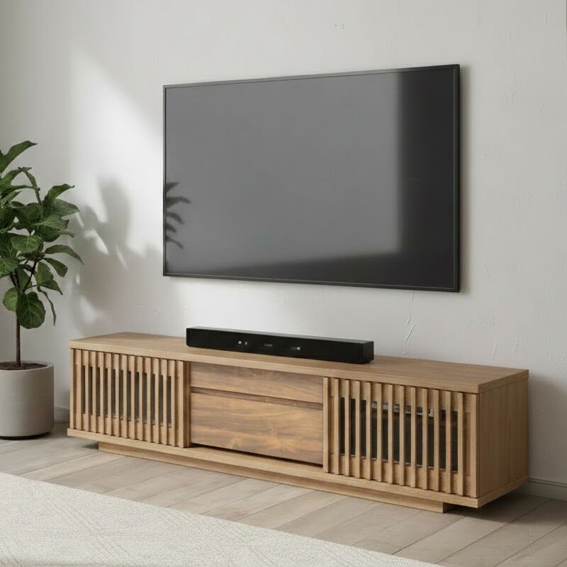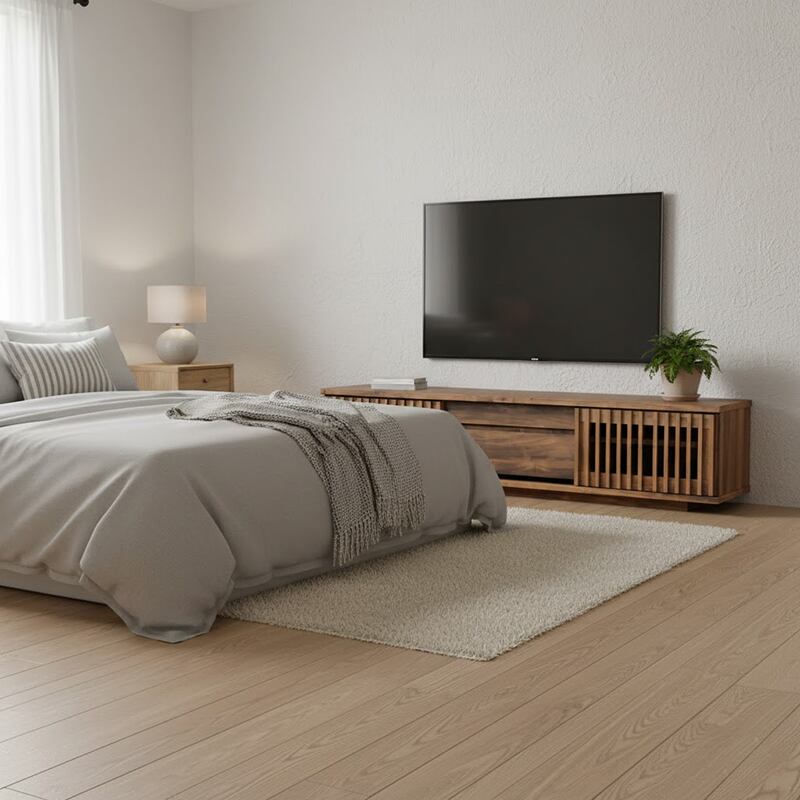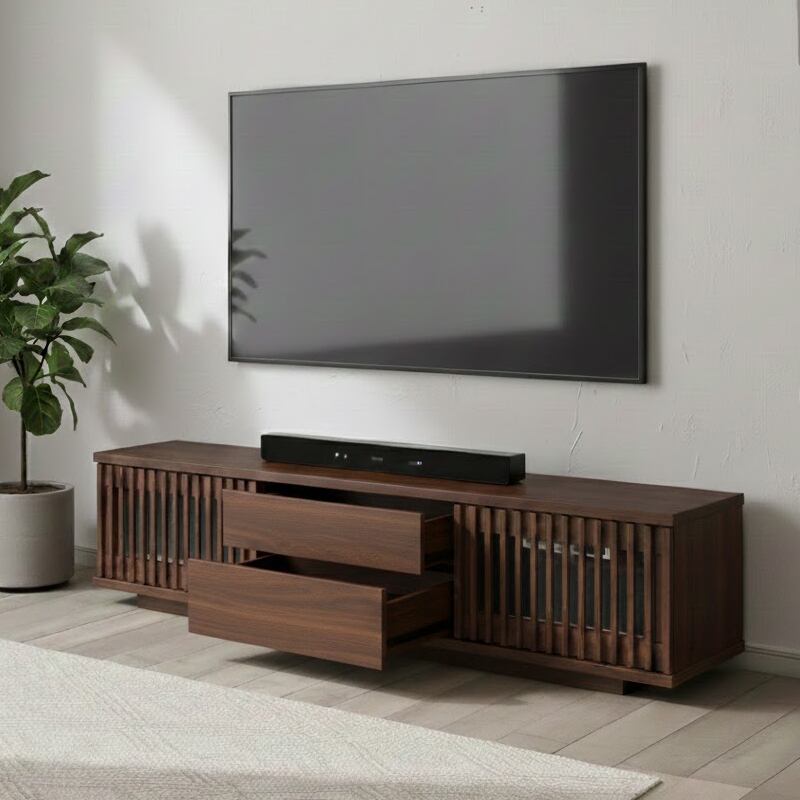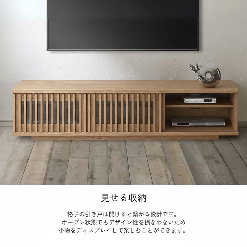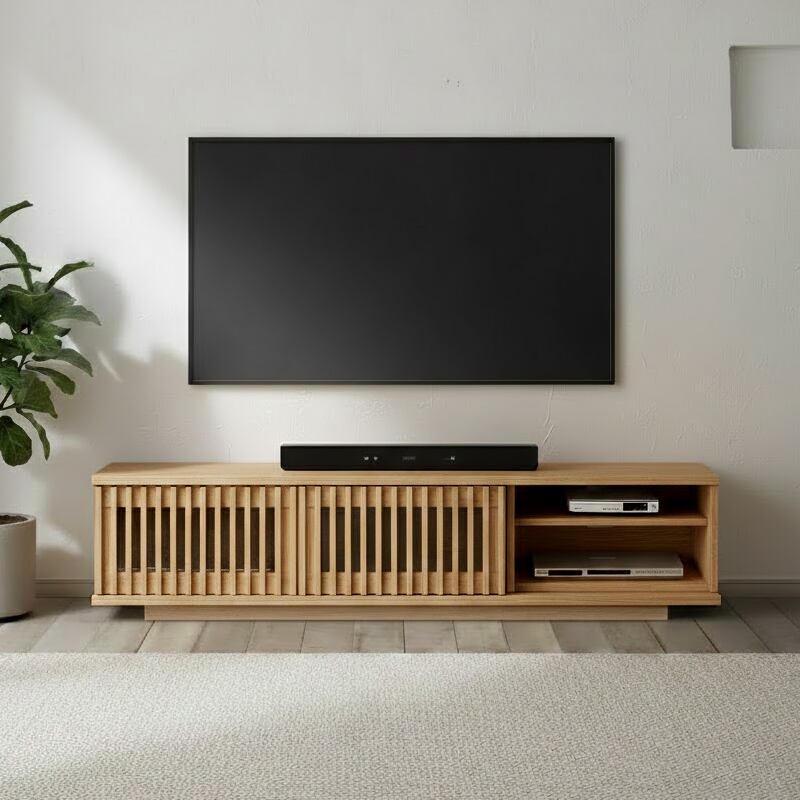 直線を基調とした静かなデザインは、北欧モダンと日本の住空間思想を融合させた“ジャパンディ”スタイル。大型テレビにも対応するワイド設計でありながら、圧迫感を抑えた水平ラインが空間に整然とした印象をもたらします。