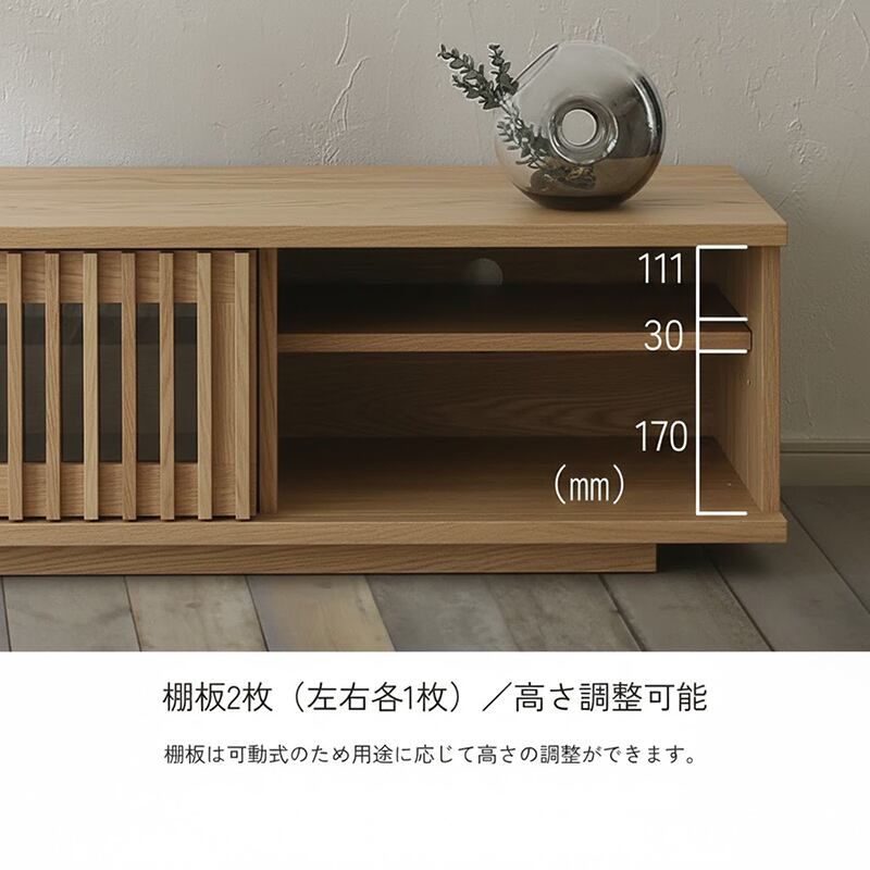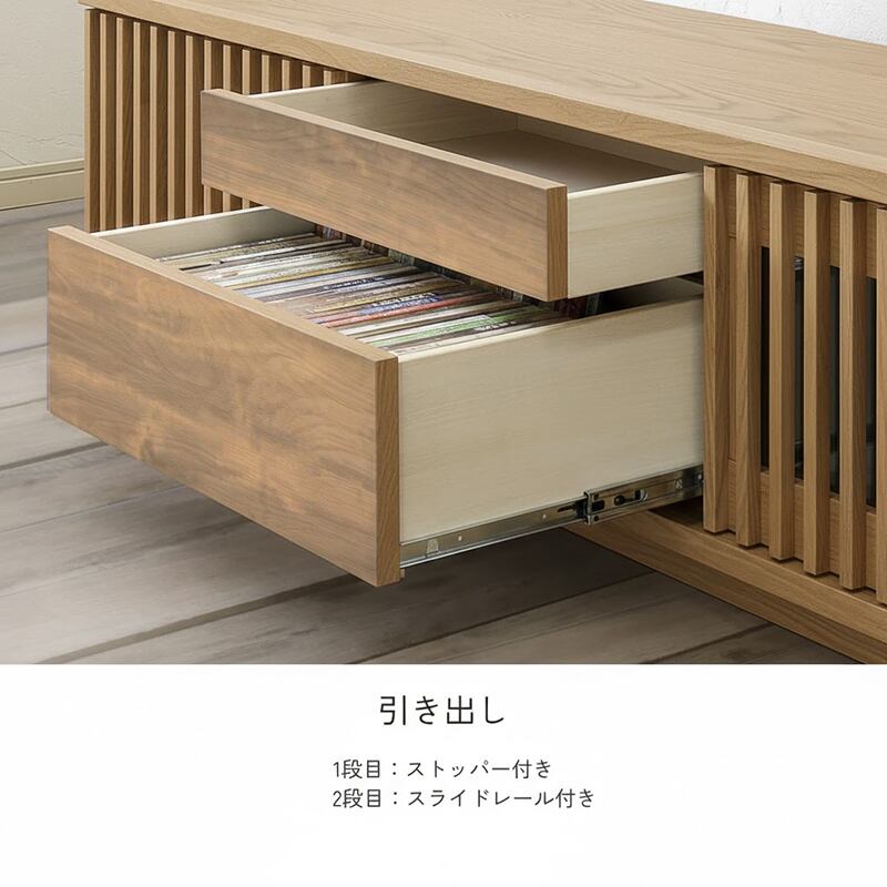 収納は引出しと可動棚付き引き戸を備え、AV機器や日用品を効率よく整理可能。背面化粧仕上げのため、間仕切り配置にも対応します。自然塗装仕上げ、完成品でのお届け。