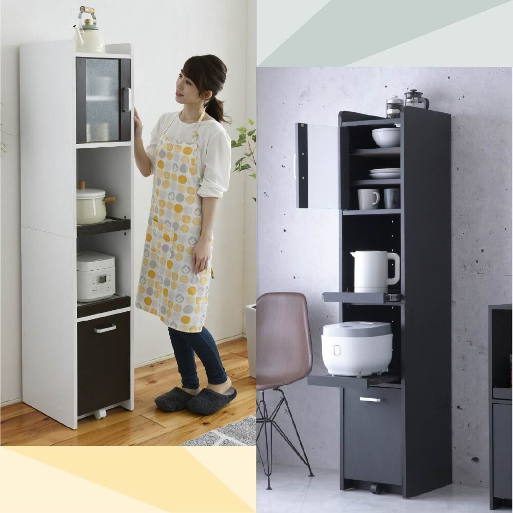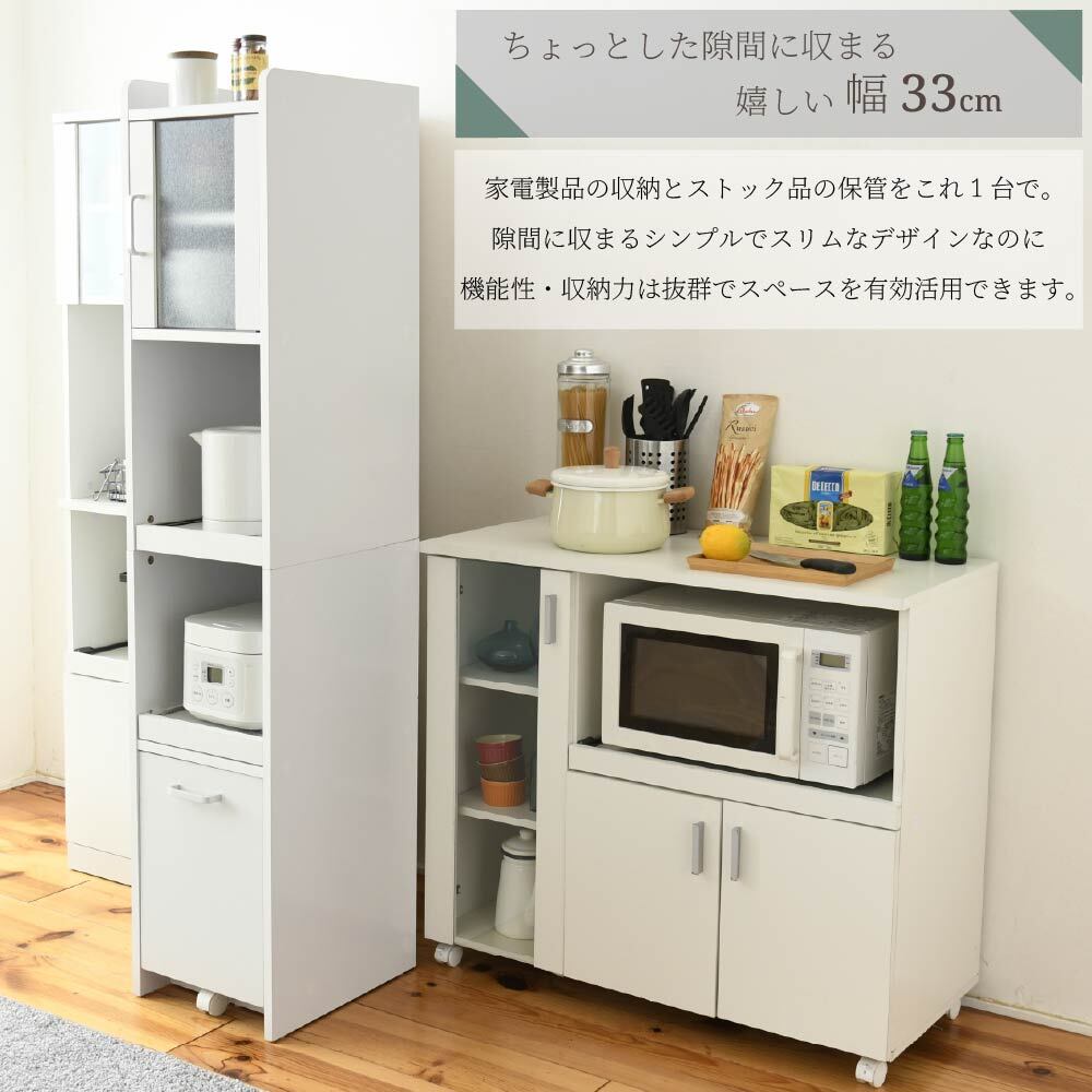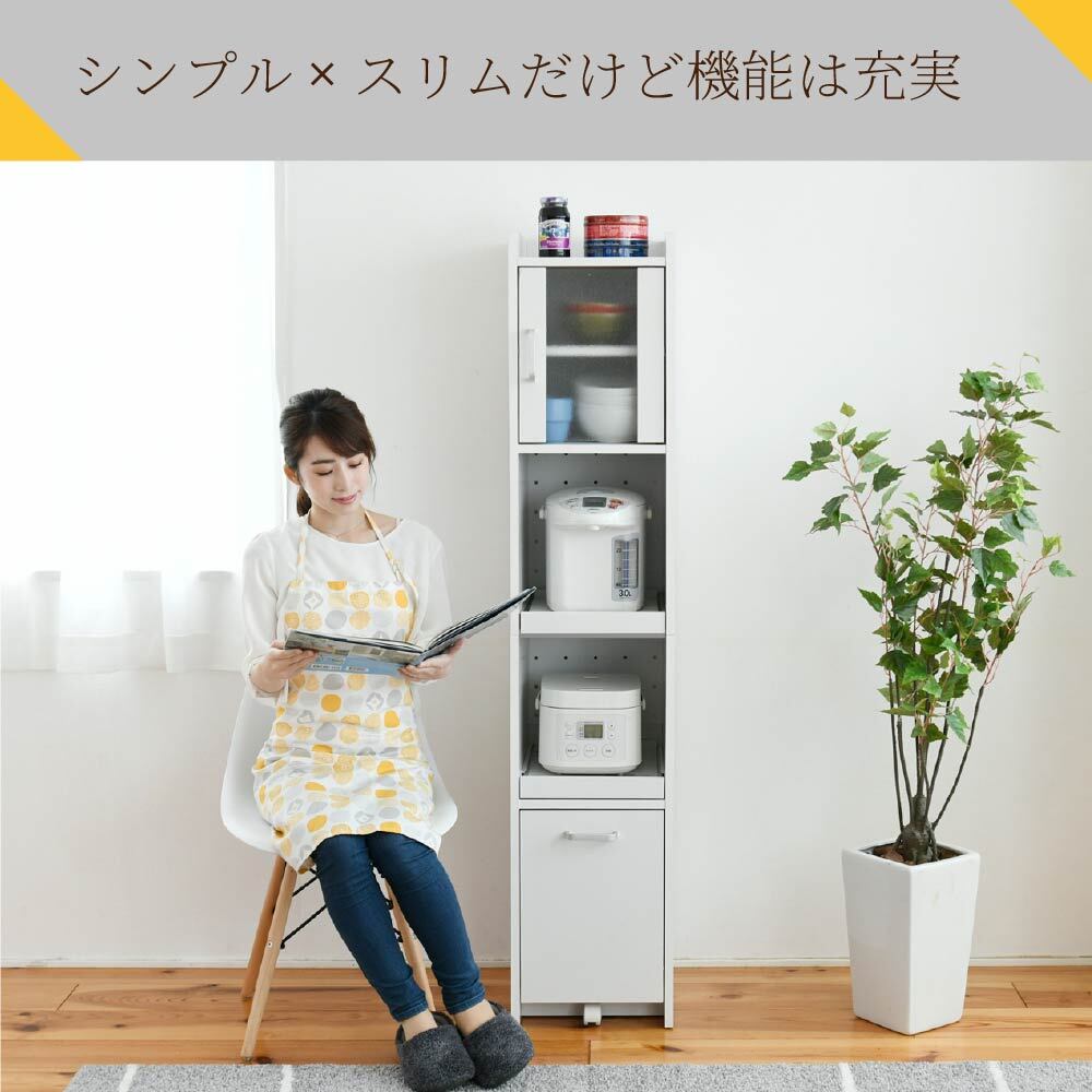 隙間収納スリム家電ラック。冷蔵庫横やキッチン横のわずか32.5cmに収まり、すりガラス扉で生活感をやさしく隠す上品な収納ラックです。