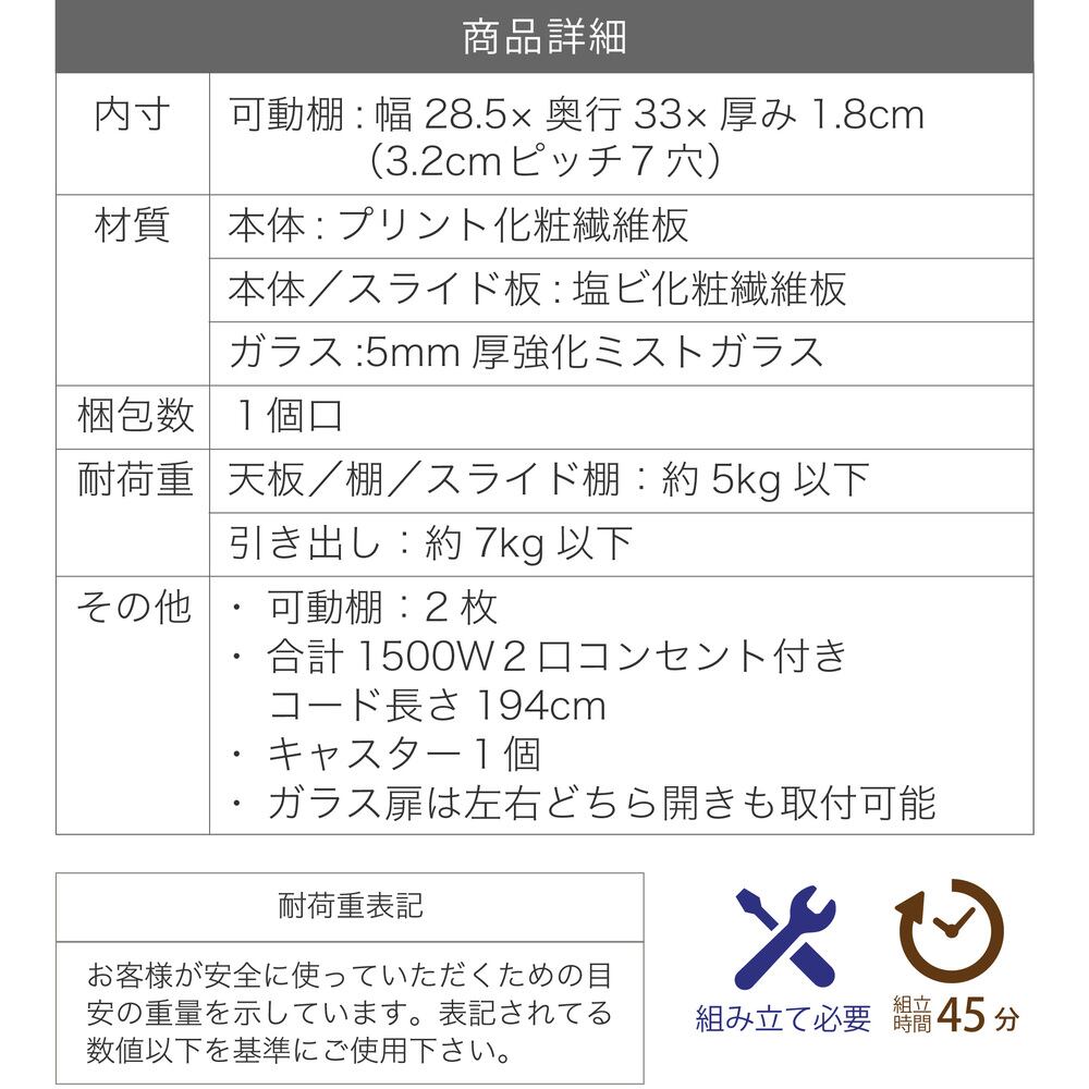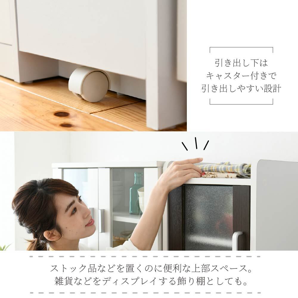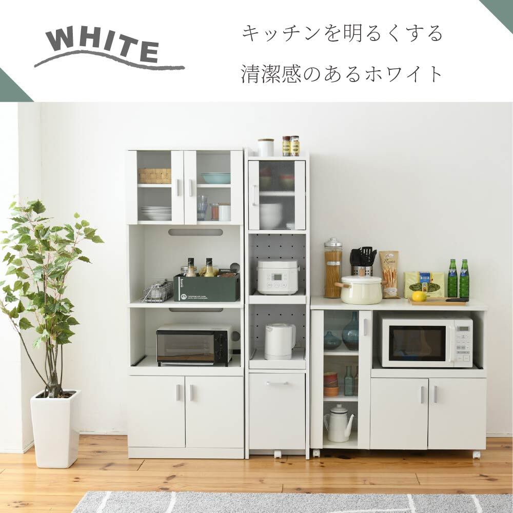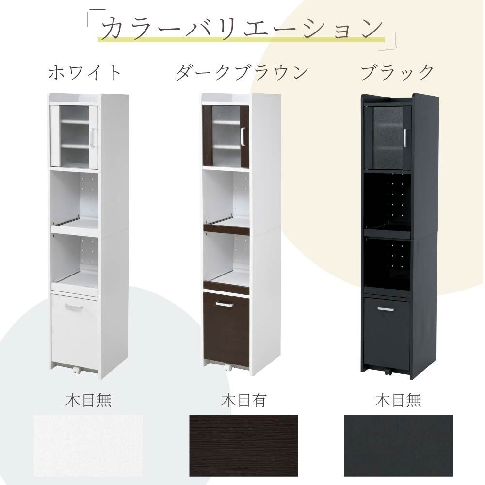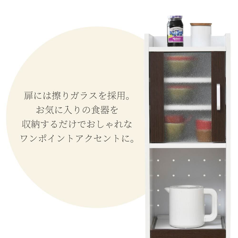 隙間収納スリム家電ラック。冷蔵庫横やキッチン横のわずか32.5cmに収まり、すりガラス扉で生活感をやさしく隠す上品な収納ラックです。