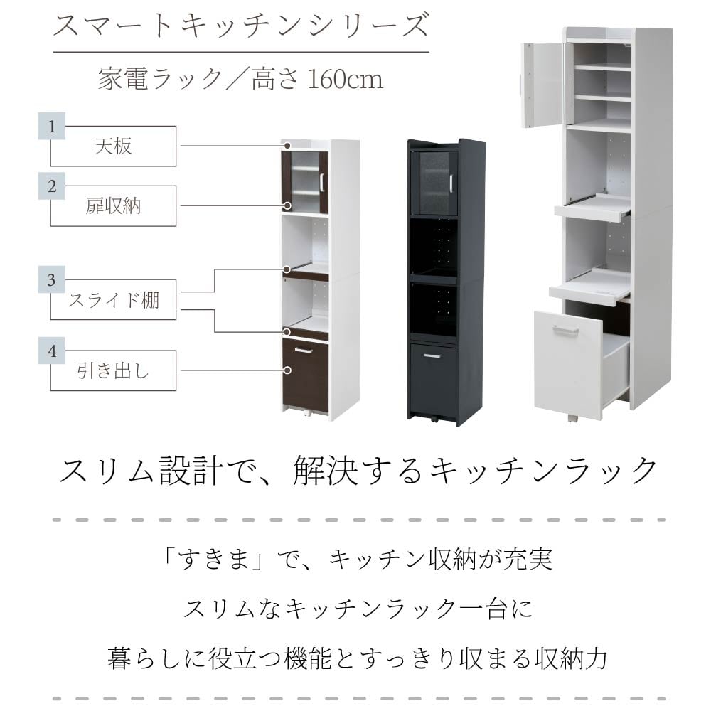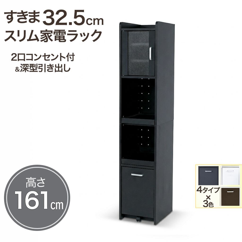 すきま収納スリム家電ラック|冷蔵庫横・キッチン横に置ける幅32.5cm|すりガラス扉で生活感を隠す上品収納 161cmタイプ