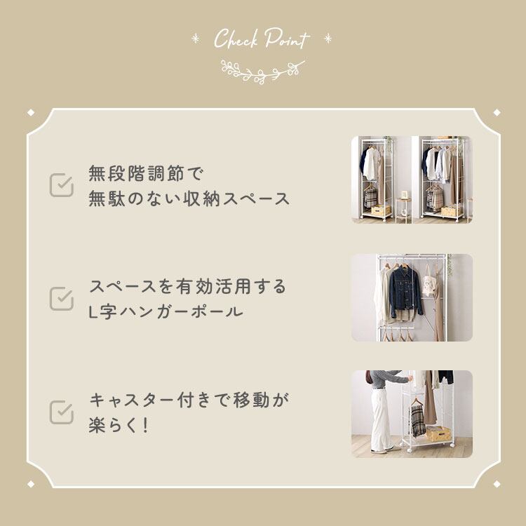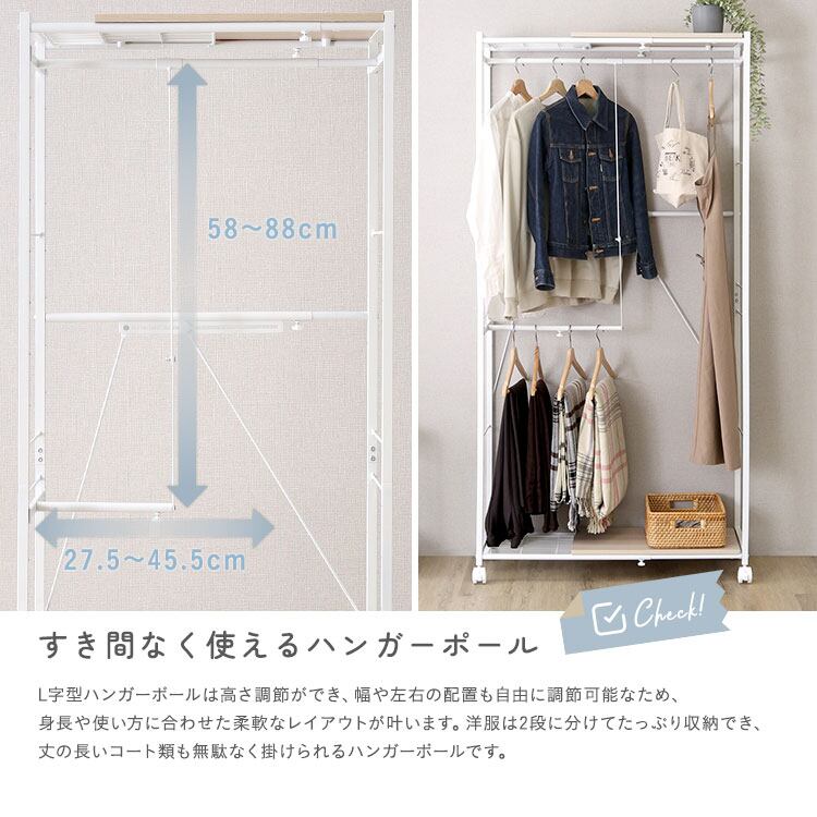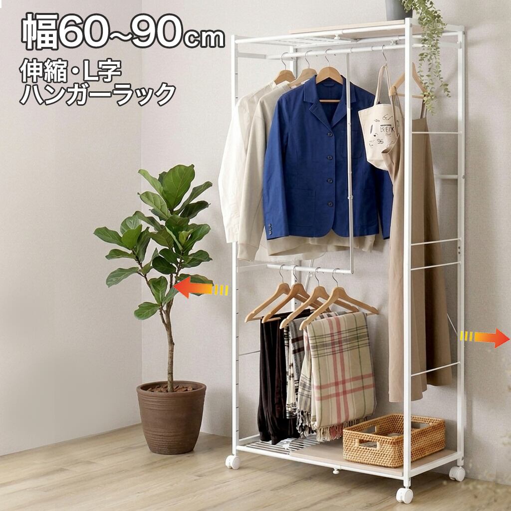 伸縮式ハンガーラック|L字ワードローブ 幅調整可能 キャスター付き 省スペース 洋服収納 寝室・ワンルーム対応 北欧モダン