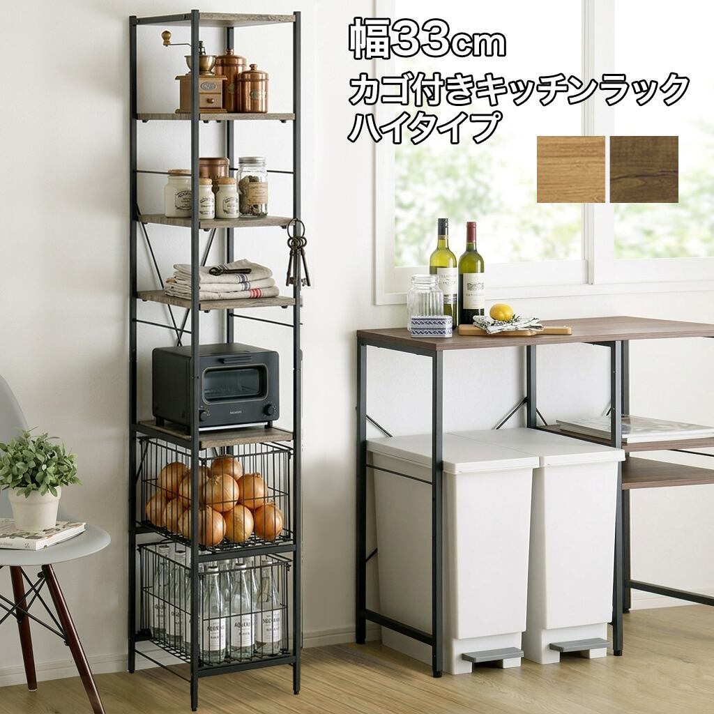 すきま収納キッチンラック 幅33cm スリムキッチン収納ラック バスケット収納 スライド棚付き キッチンすき間収納 ハイタイプ ヴィンテージ調