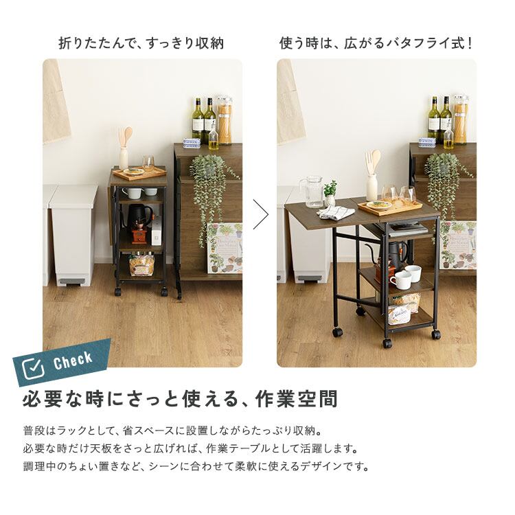 バタフライワゴン キッチンワゴン 折りたたみ 伸縮 作業台として使える、省スペース特化の可変収納ワゴン。