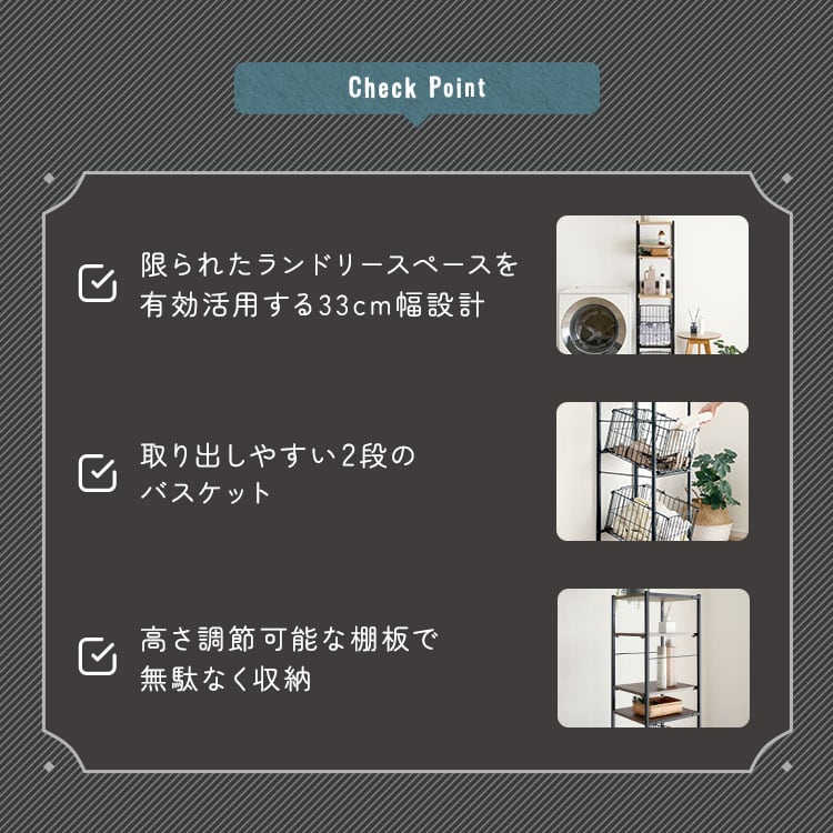 ランドリーラック スリム 幅33 洗濯機横 収納 カゴ付き ランドリー収納 隙間収納 洗面所ラック 収納棚 ヴィンテージ調
