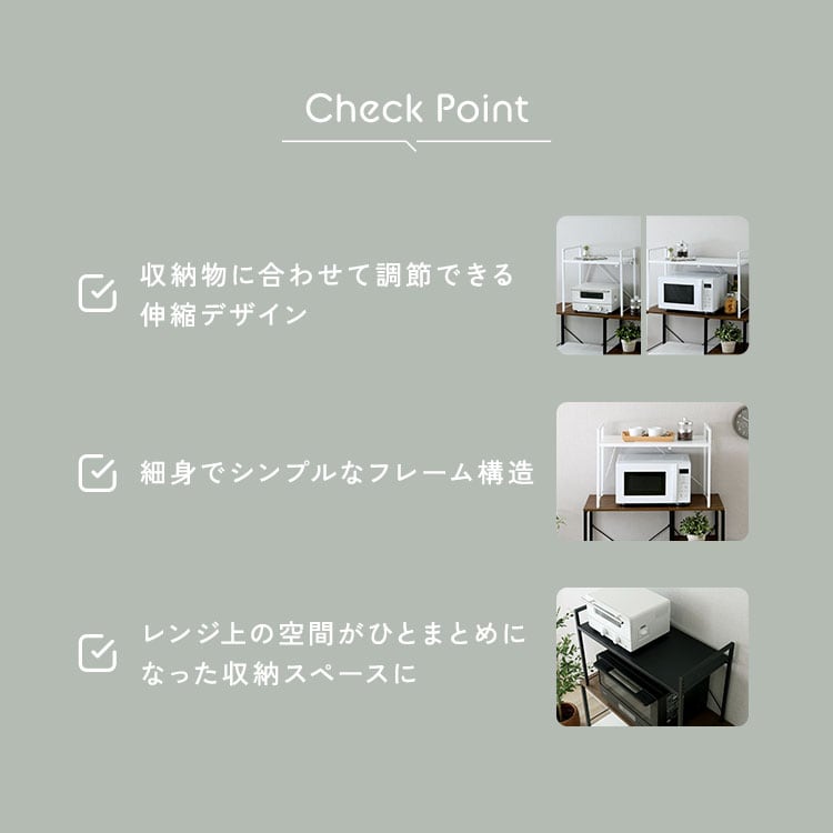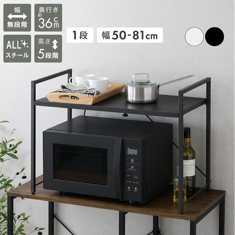 レンジ上ラック 伸縮 幅50〜81可動棚 1段 キッチンラック 電子レンジラック 卓上ラック キッチン収納 スリム ブラック ホワイトスチール