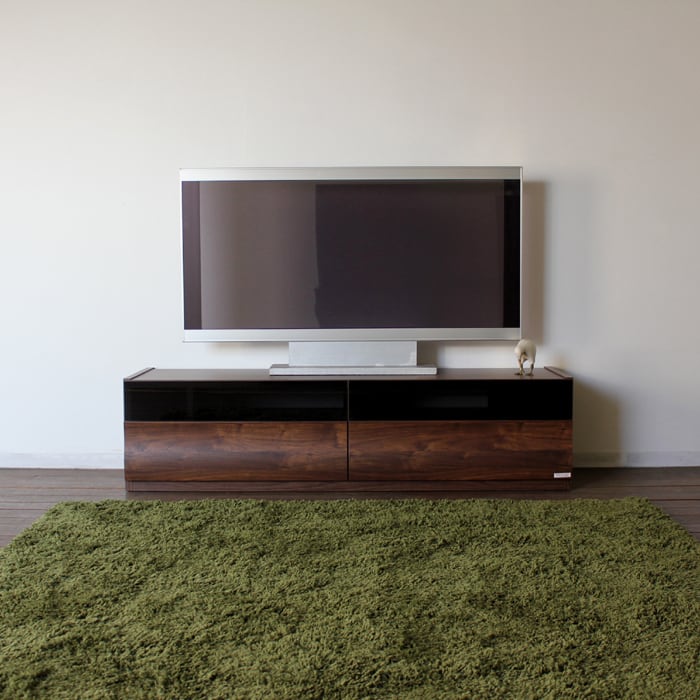 引出し面に立体的なウェーブ加工が施されておりウォールナットとブラックガラスの重厚感の中にも柔らかなイメージを兼ね備えた女性にも人気のデザインです。