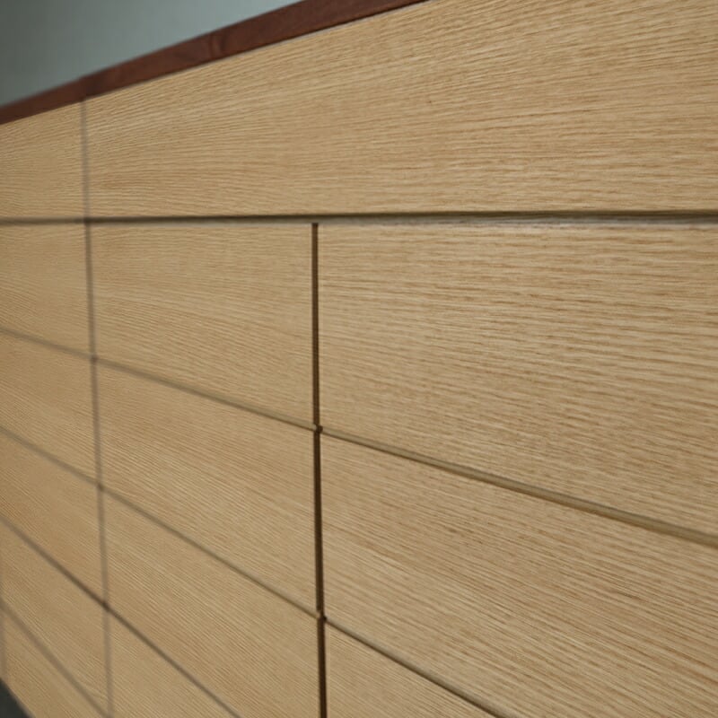 このBYシリーズは表面素材としてサスティナブル素材としてその突板(ツキイタ)と言われる日本の家具製造において昔から伝わる天然木シートを使用。良質の美しい木目の家具を安定してお届けできる日本の技と言えます。幅広い年齢層に人気の高いオーク材の個性を感じる板目仕様。