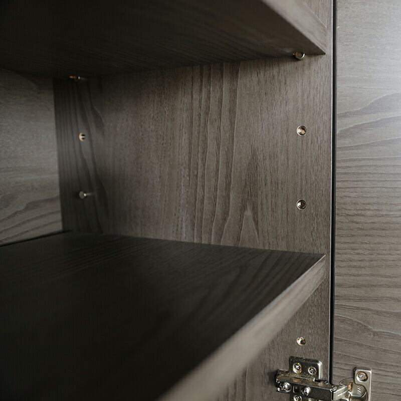 上部はシンプルな取っ手の無いプッシュ式扉仕様になっており扉内には様々な収納物に対応した棚板2枚仕様となっております。またルーターやモデム、ハードディスクなどが収納できるよう背面に配線口を完備した設計となっております。