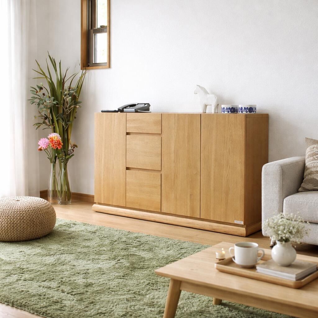 表面材には日本製の強化硬質シートを前面及び天板トップに使用しております。この強化硬質シートとは、表面強度に優れ室内環境に配慮した家具、建装材としてデザイン・品質設計された非塩ビ化粧フィルム です。室内建具・造作材をはじめキッチン扉・収納家具材など幅広い用途で使用されている素材です。メンテナンスの必要がなく無垢材や突板(天然木シート材)に比べ日焼けや熱や寒さにも非常に強く心材にはフラッシュボード(パネル構造板)を使用しており反りや割れの心配もございません。また汚れやキズにも強く日常のお手入れもカラ引きで十分OK。また天板枠には無垢材をトメ継ぎ加工で巻いておりデザイン性でも優れた仕上がりとなっております。家具本体の組み立て、生産は日本有数の家具産地である福岡県大川市の当店指定工場にて生産。