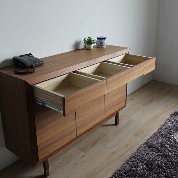 先程の引出しの前板に使われている突板(つきいた)とは無垢材をスライス状に加工した言うなれば天然木の薄いシートを前面の扉は無垢材、側板には軽量フラッシュ構造ボードに圧着し一枚のパネルにしており、この高度な日本の技術により強度と軽量化を両立した国産ならではの材質、構造ともに狂いの少ない優れた商品になっております。そして使われている木材も木目の美しモノを厳選して使用しており機能美と素材美を兼ね備えた美しい収納アイテムです。