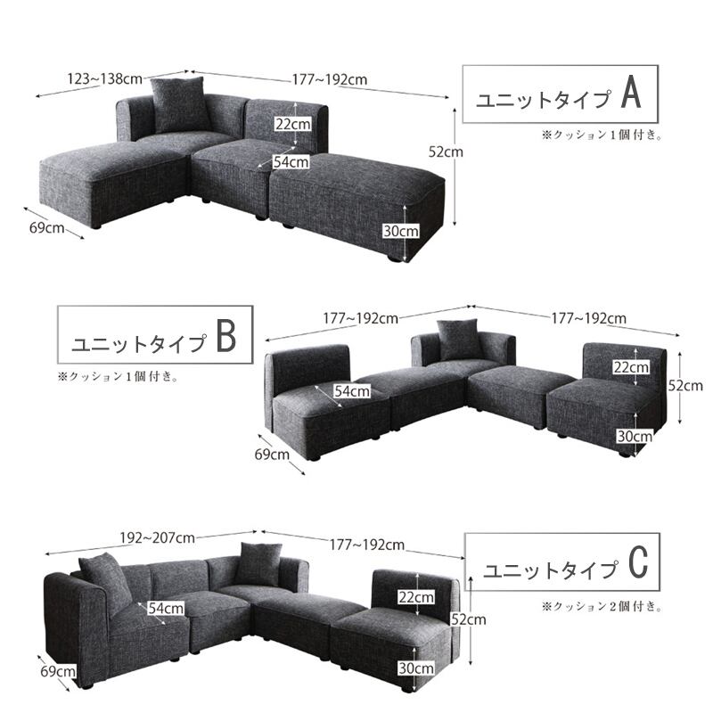 ※クッションは、コンパクトタイプ・ミドルタイプに1個、ラージタイプに2個、コーナー<単品>に1個付属します。(【コーナー】と同数)