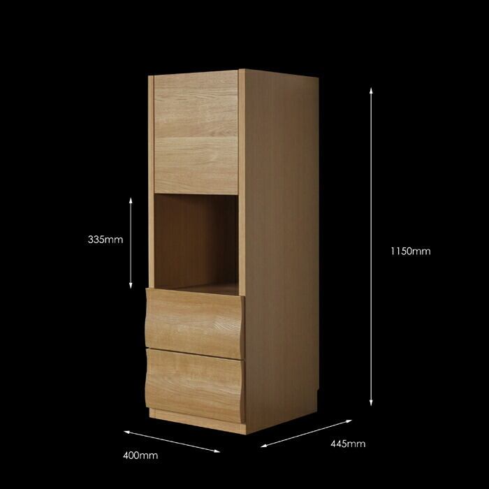引出し面に立体的なウェーブ加工が施されており、オーク調の美しい木目と合わさり柔らかなイメージを兼ね備えた女性にも人気のデザインです。