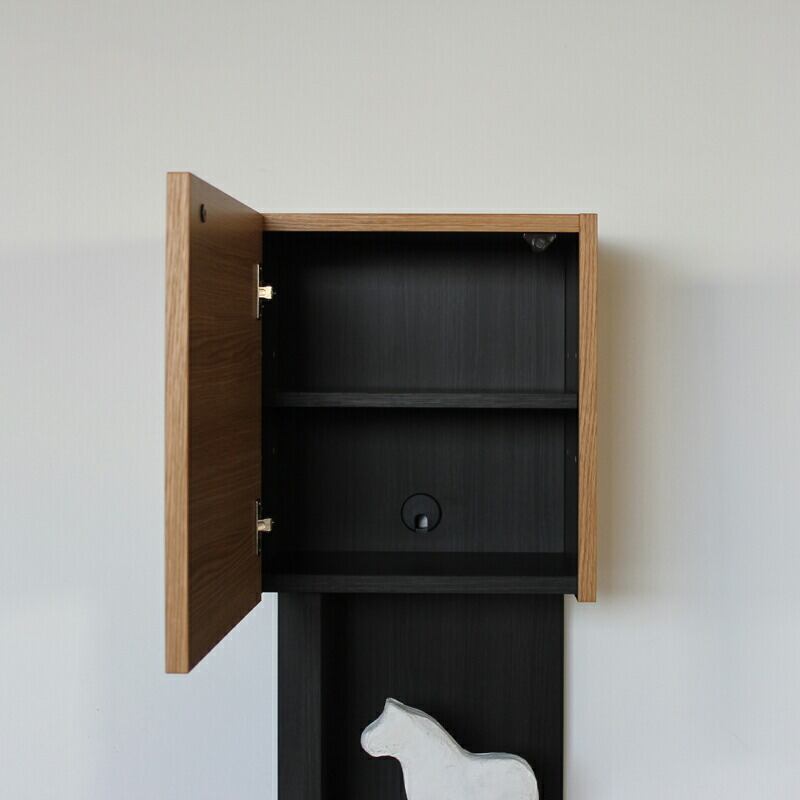 先程の天板・側板に使われている突板(つきいた)とは無垢材をスライス状に加工した言うなれば天然木の薄いシートを軽量フラッシュ構造ボードに圧着し一枚のパネルにしており、この高度な日本の技術により強度と軽量化を両立した国産ならではの材質、構造ともに狂いの少ない優れた商品になっております。そして使われている木材も木目の美しモノを厳選して使用しており機能美と素材美を兼ね備えた美しい収納アイテムです。