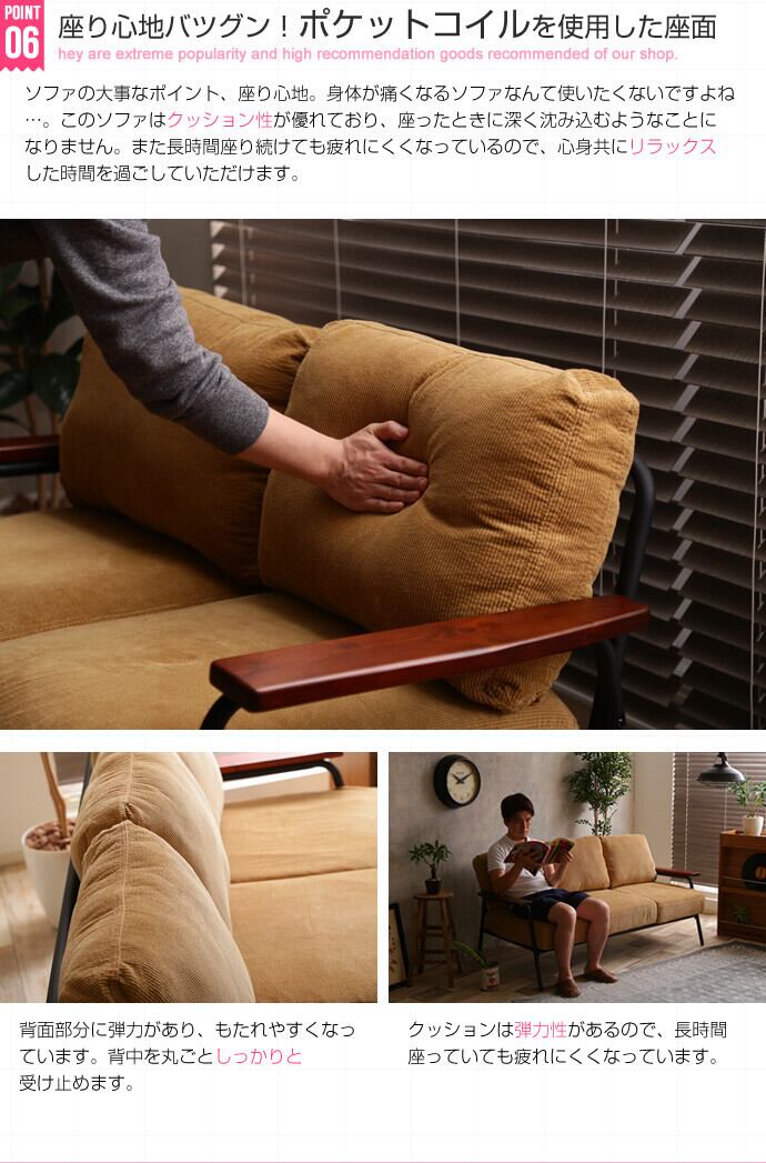コーデュロイとブラックスチールのフレームと天然木の肘置きを組み合わせた優しい雰囲気のソファ