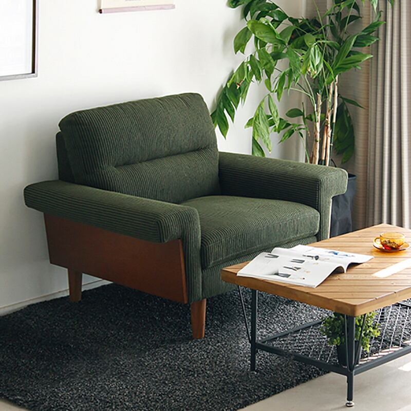 無垢脚による安定感も抜群で、長時間座っていても快適です。幅93×奥行き83×高さ78cmのコンパクトサイズなので、1人暮らしやコンパクトな空間にもピッタリ。カーキーやグリーンなど豊富なカラーバリエーションもご用意しており、お部屋のインテリアに合わせてお選びいただけます。ミッドセンチュリーや北欧テイストのお部屋づくりにもおすすめです。