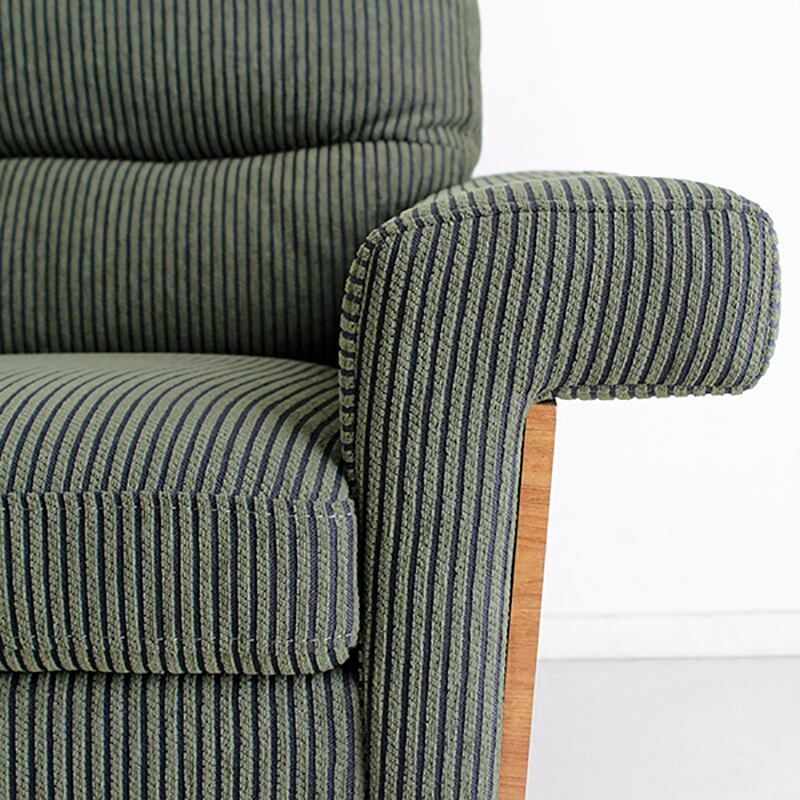 1970年代の活発なデザイン文化をイメージしたアーム形状。同時に幅広のアームはゆったりと使いやすく実用性も兼ね備えたこのソファを象徴とするデザイン。 デザイン性を上げてくれるサイド化粧パネルには木目が美しく高級感を感じさせるウォールナット材の突板張り(天然木シート)を採用。カジュアルなりがちなコンパクトソファをスタイリッシュに演出。