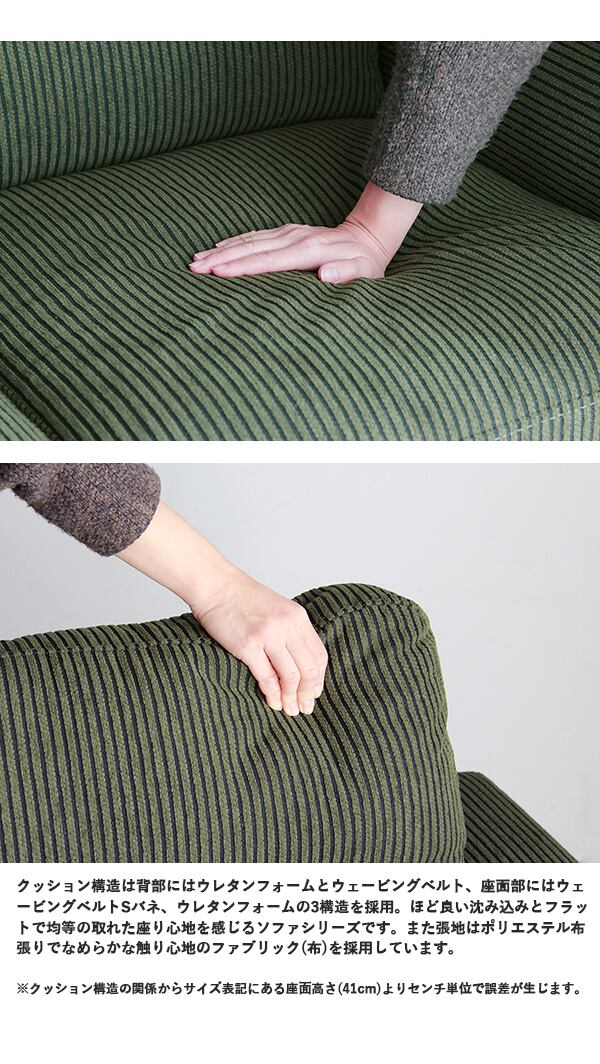 クッション構造は背部にはウレタンフォームとウェービングベルト、座面部にはウェービングベルトSバネ、ウレタンフォームの3構造を採用。ほど良い沈み込みとフラットで均等の取れた座り心地を感じるソファシリーズです。また張地はポリエステル布張りでなめらかな触り心地のファブリック(布)を採用しています。
