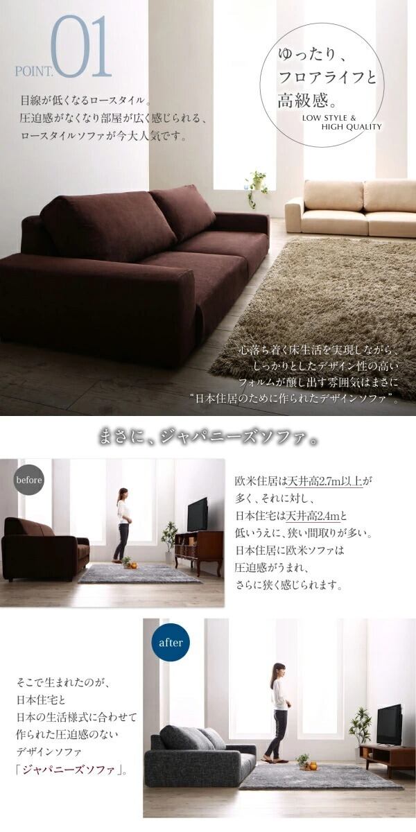 目線が低くなるロースタイル。圧迫感がなくなり部屋が広く感じられる、床により近くなり落ち着く、ロースタイルソファが今大人気です。 目指したのは、ロースタイルでも、高級感のあるしっかりソファ。心落ち着く床生活を実現しながら、しっかりとしたデザイン性の高いフォルム が醸し出す雰囲気はまさに日本住居の為に設計されたデザインソファ。