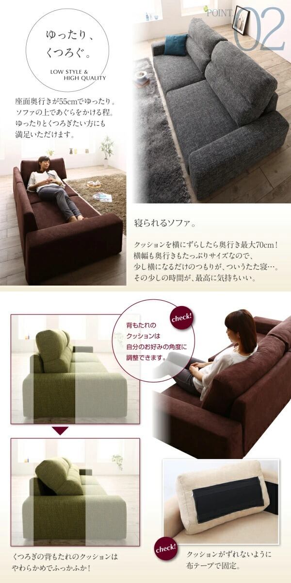 ゆったり、くつろぐ。座面奥行きが55cmでゆったり。ソファの上であぐらをかける程。大きく座面をとっているので、体の大きい方も、 ゆったりとくつろぎたい方にも満足いただけます。寝られるソファ。