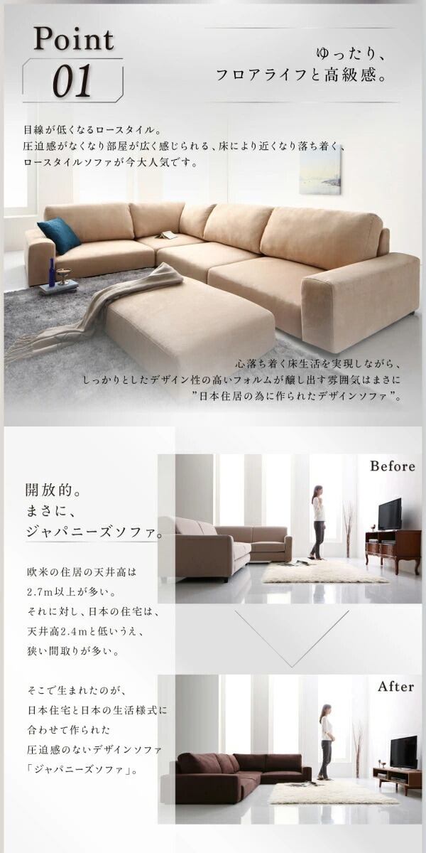 目線が低くなるロースタイル。圧迫感がなくなり部屋が広く感じられる、床により近くなり落ち着く、ロースタイルソファが今大人気です。 目指したのは、ロースタイルでも、高級感のあるしっかりソファ。心落ち着く床生活を実現しながら、しっかりとしたデザイン性の高いフォルム が醸し出す雰囲気はまさに日本住居の為に設計されたデザインソファ。