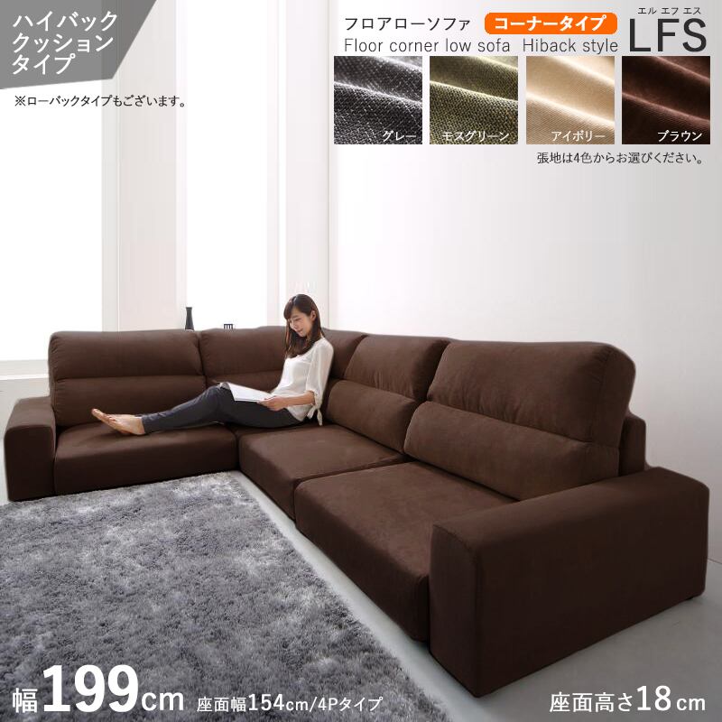 フロアソファ 【LFS/L字コーナー/3P/ハイバック】 幅199cm ブラウン色 / 全4色 3人掛け ポリエステル100%・ウレタン 別売オットマンもご用意