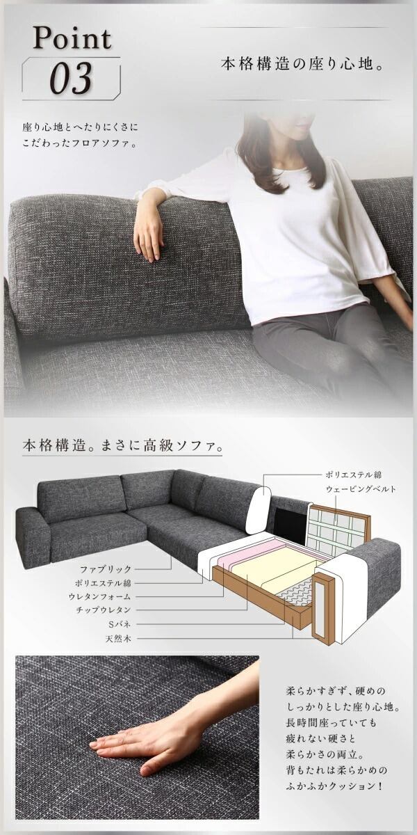 座り心地とへたりにくさにこだわったフロアソファ。しっかりとした木枠だからこそ、身体をあずけられる安心感。本格構造。まさに、高級ソファ。 柔らかすぎず、硬めのしっかりとした座り心地。長時間座っていても疲れない硬さと柔らかさの両立。連結プレートでソファ同士を繋げて離れないように 固定することができます。背もたれは柔らかめのふかふかクッション