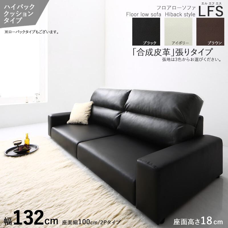 フロアソファ 【LFS/2シータータイプ/2P/ハイバック】 幅132cm ブラック色 / 全3色 2人掛け 合成皮革張り レザー・ウレタン 別売オットマンもご用意