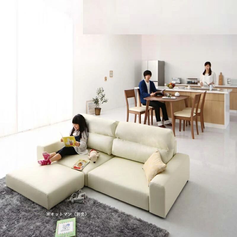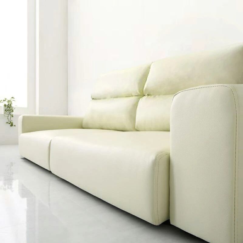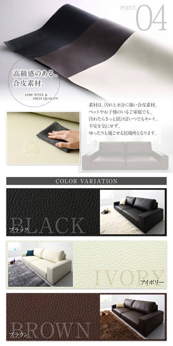 素材は、汚れと水分に強い合皮素材。ペットやお子様のいるご家庭でも、汚れたらさっと拭けばいつでもきれい。不安を気にせず、ゆったりと過ごせる 居場所となります。お色は漆黒の高級感を最も感じるブラック色。落ち着きと品を感じさせるブラウン色。優しくお部屋に明るさを与えてくれるアイボリー色 の3色からお選びください。