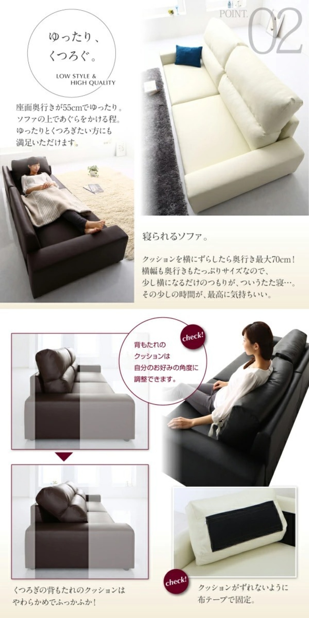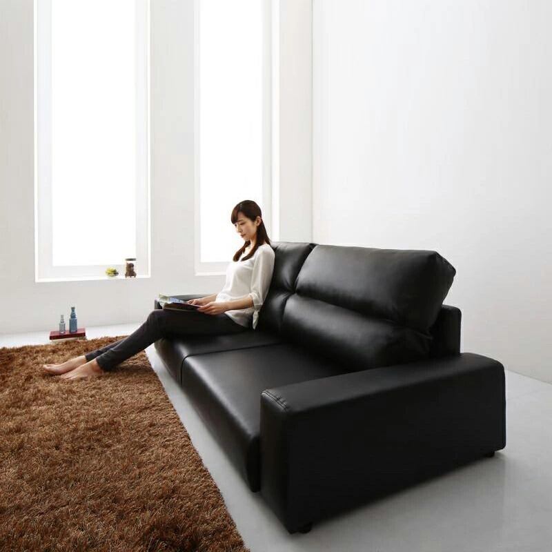 ゆったり、くつろぐ。座面奥行きが55cmでゆったり。ソファの上であぐらをかける程。大きく座面をとっているので、体の大きい方も、 ゆったりとくつろぎたい方にも満足いただけます。寝られるソファ。