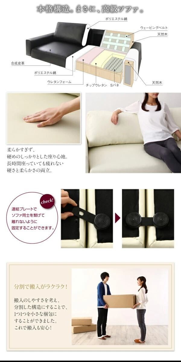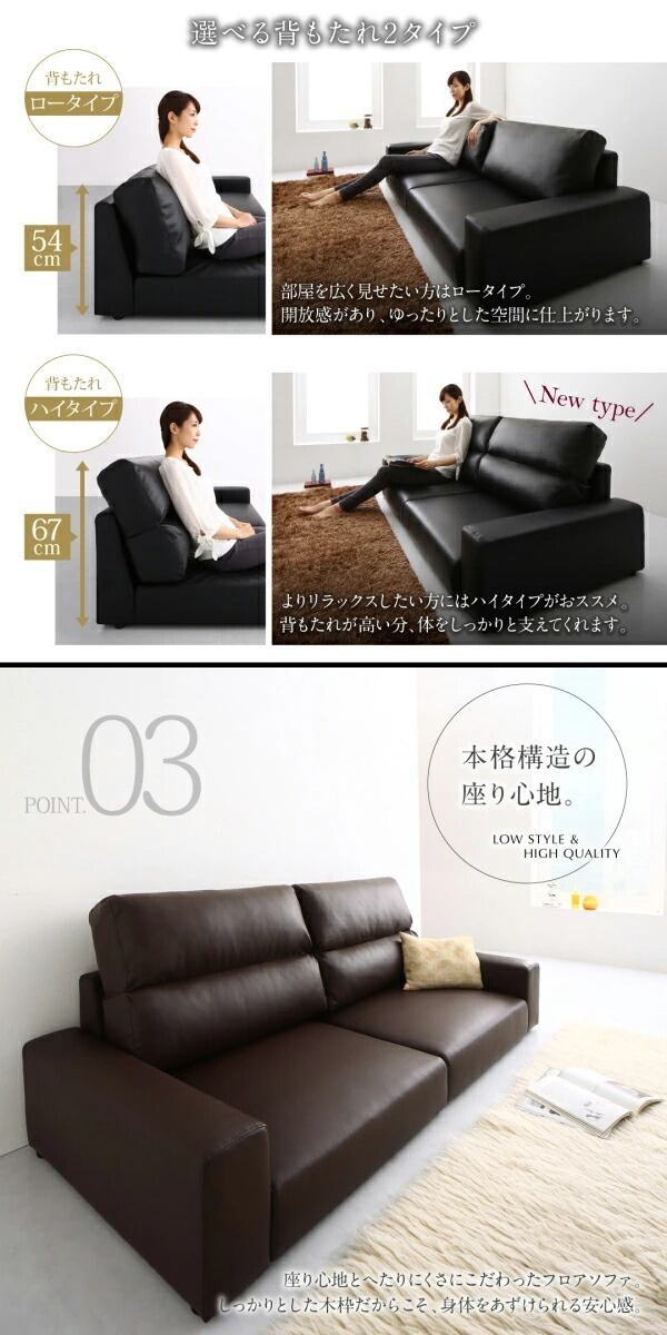 座り心地とへたりにくさにこだわったフロアソファ。しっかりとした木枠だからこそ、身体をあずけられる安心感。本格構造。まさに、高級ソファ。 柔らかすぎず、硬めのしっかりとした座り心地。長時間座っていても疲れない硬さと柔らかさの両立。連結プレートでソファ同士を繋げて離れないように 固定することができます。背もたれは柔らかめのふかふかクッション