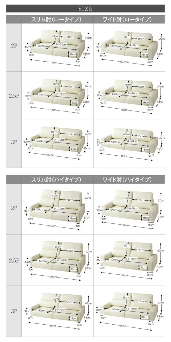 横幅(ワイド肘)132/(スリム肘)116 ×奥行83×高さ(ハイタイプ)67 cm